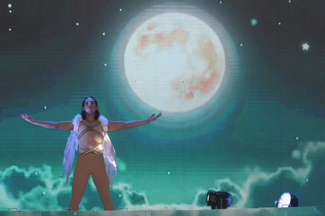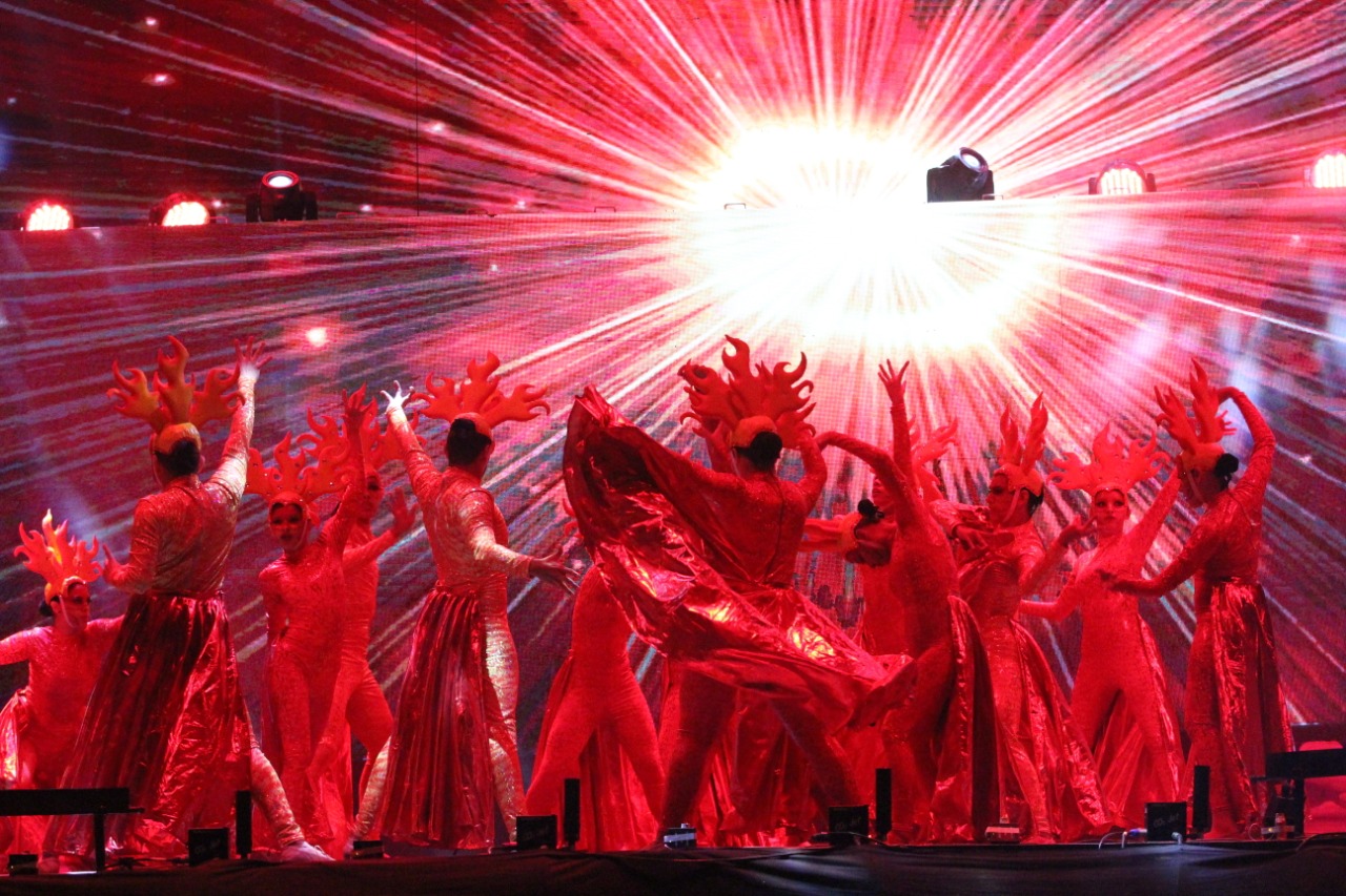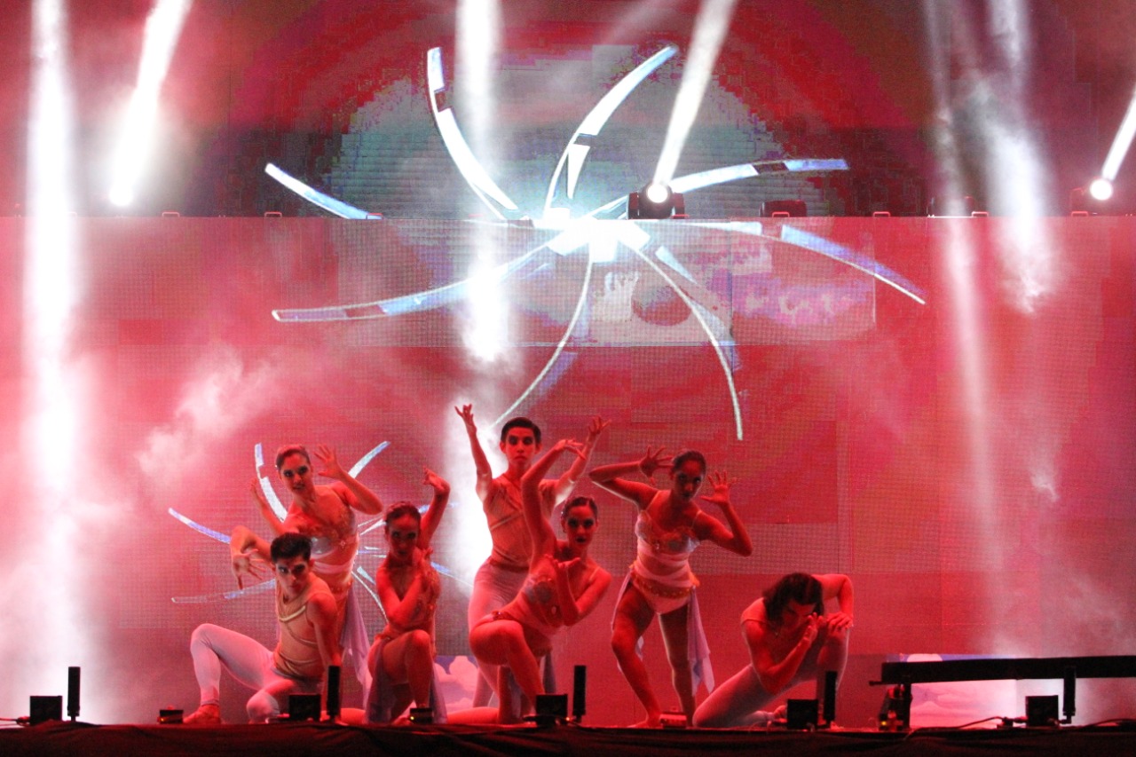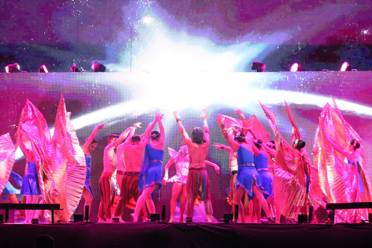 Las danzas en el escenario y una doble pantalla gigante mostraron a los asistentes el cosmos, el nacimiento y la evolución de un nuevo mundo, tal como lo representa el equinoccio, evento astronómico que marca el comienzo de una nueva era.