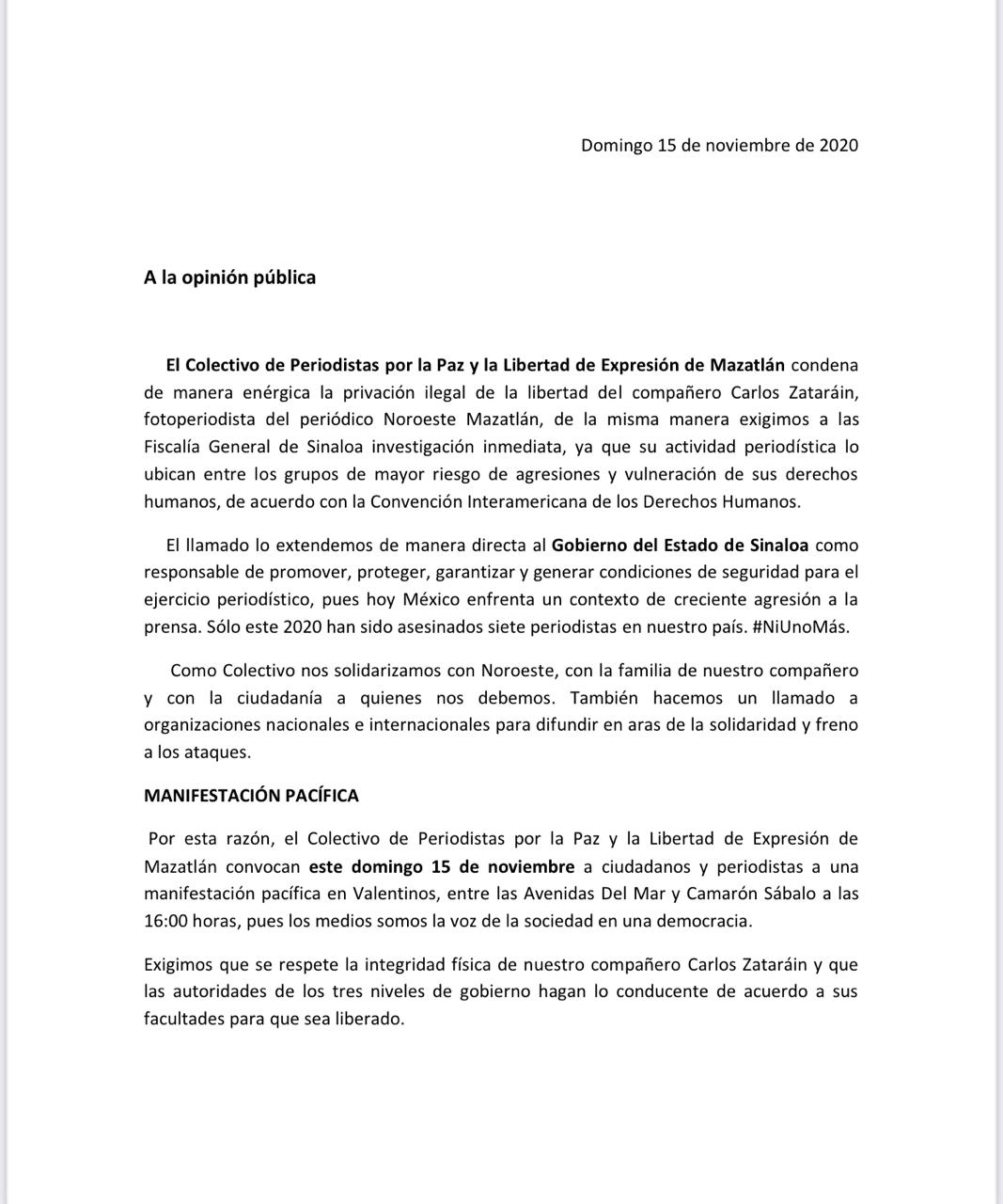 Por su parte, el Colectivo de Periodistas de Mazatlán emitió ya un posicionamiento en el que exigen la actuación inmediata de la autoridad y piden que se respete la integridad Carlos Zatarain.