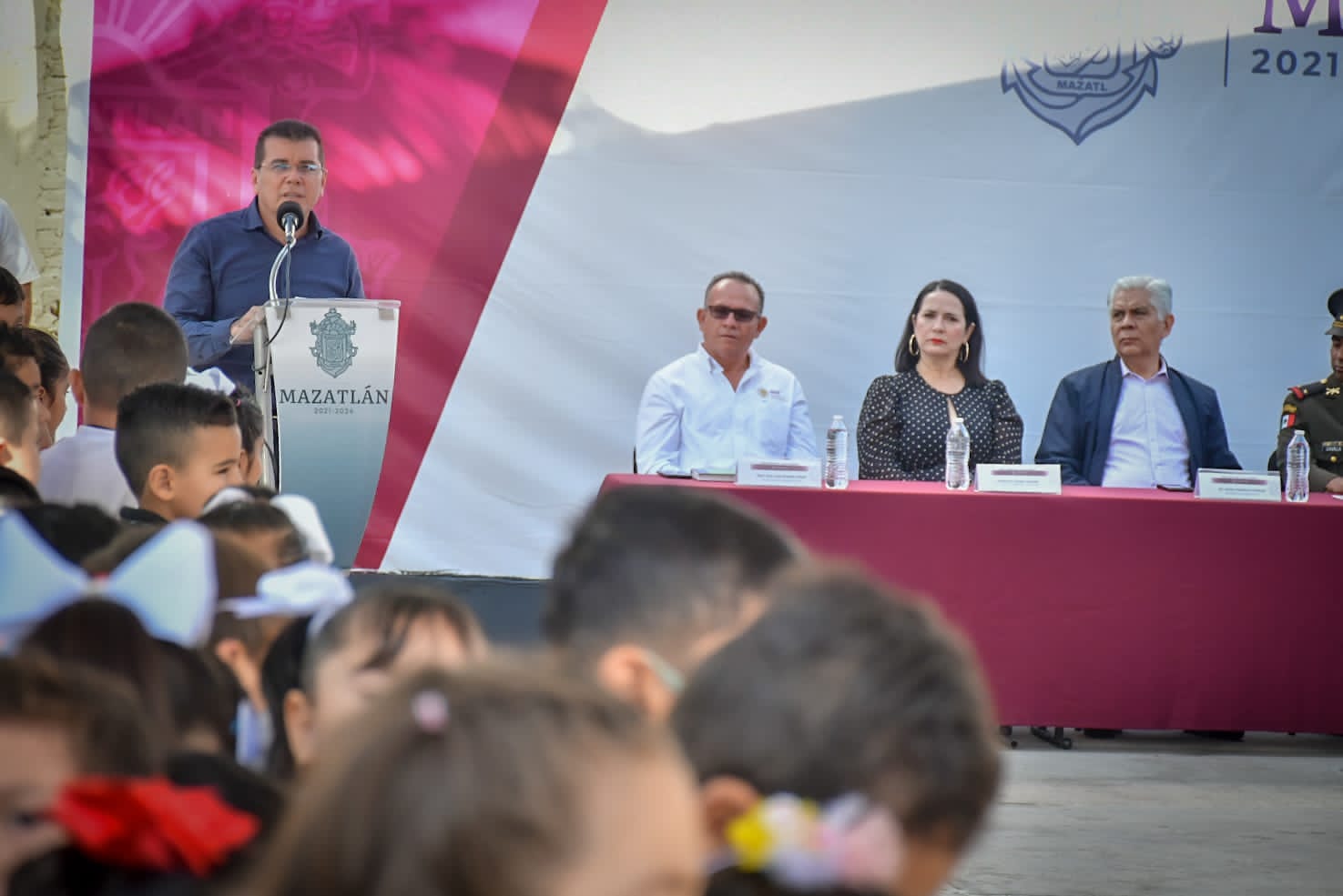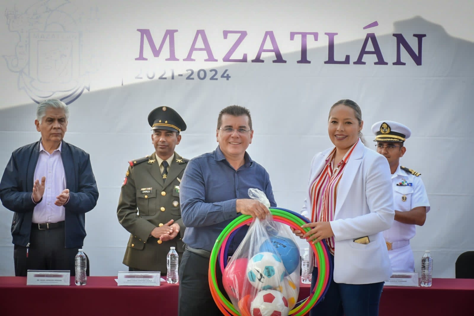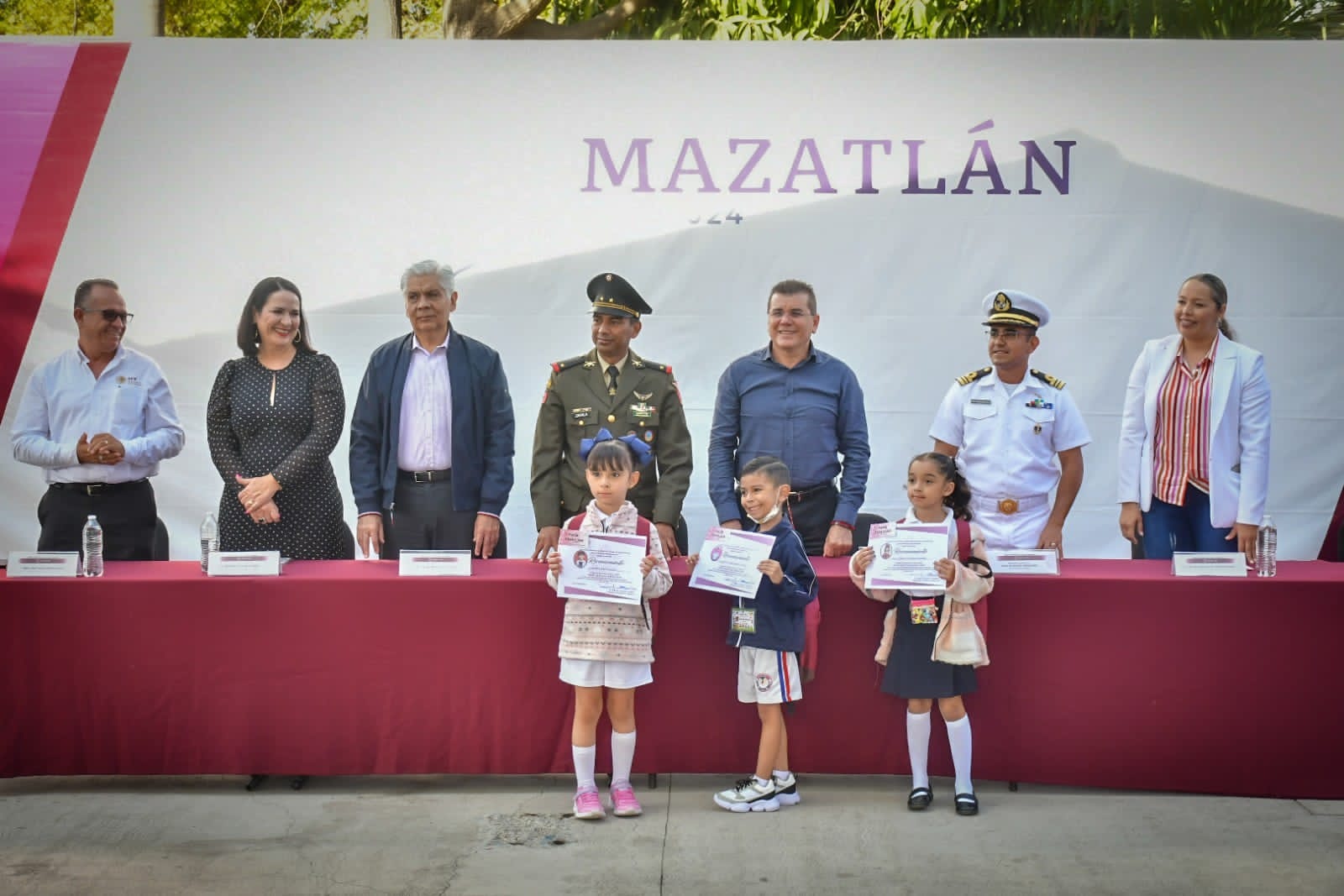 En el marco del Lunes Cívico las autoridades militares, navales, educativas, de salud, regidores, alumnos, maestros y funcionarios de las diferentes dependencias realizaron honores a la bandera, entonaron el himno nacional, el Alcalde Edgar González entregó material deportivo a la Directora y estudiantes destacados recibieron un diploma y un pase familiar para visitar el Acuario Mazatlán.