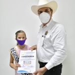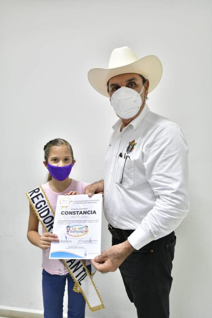 Kaory Peña Serrano recibió esta mañana su banda y constancia como Regidora del Cabildo Infantil 2020, de parte de su homólogo, el Edil Felipe de Jesús Velarde Sandoval.