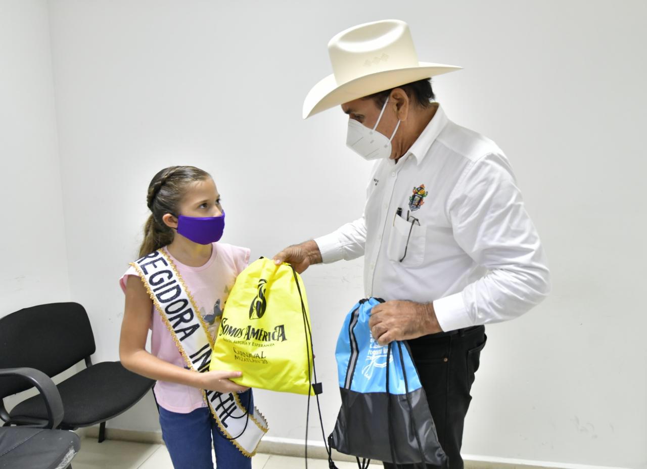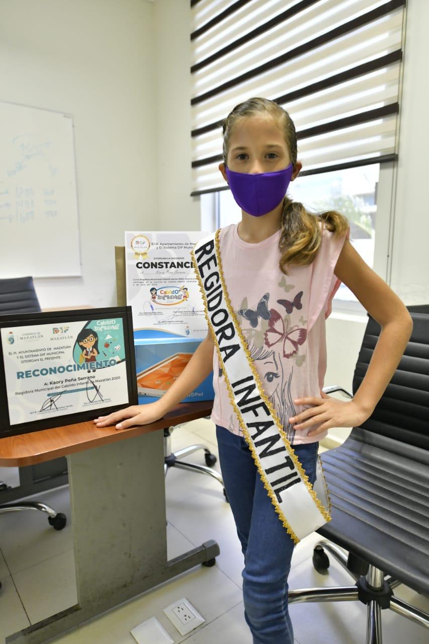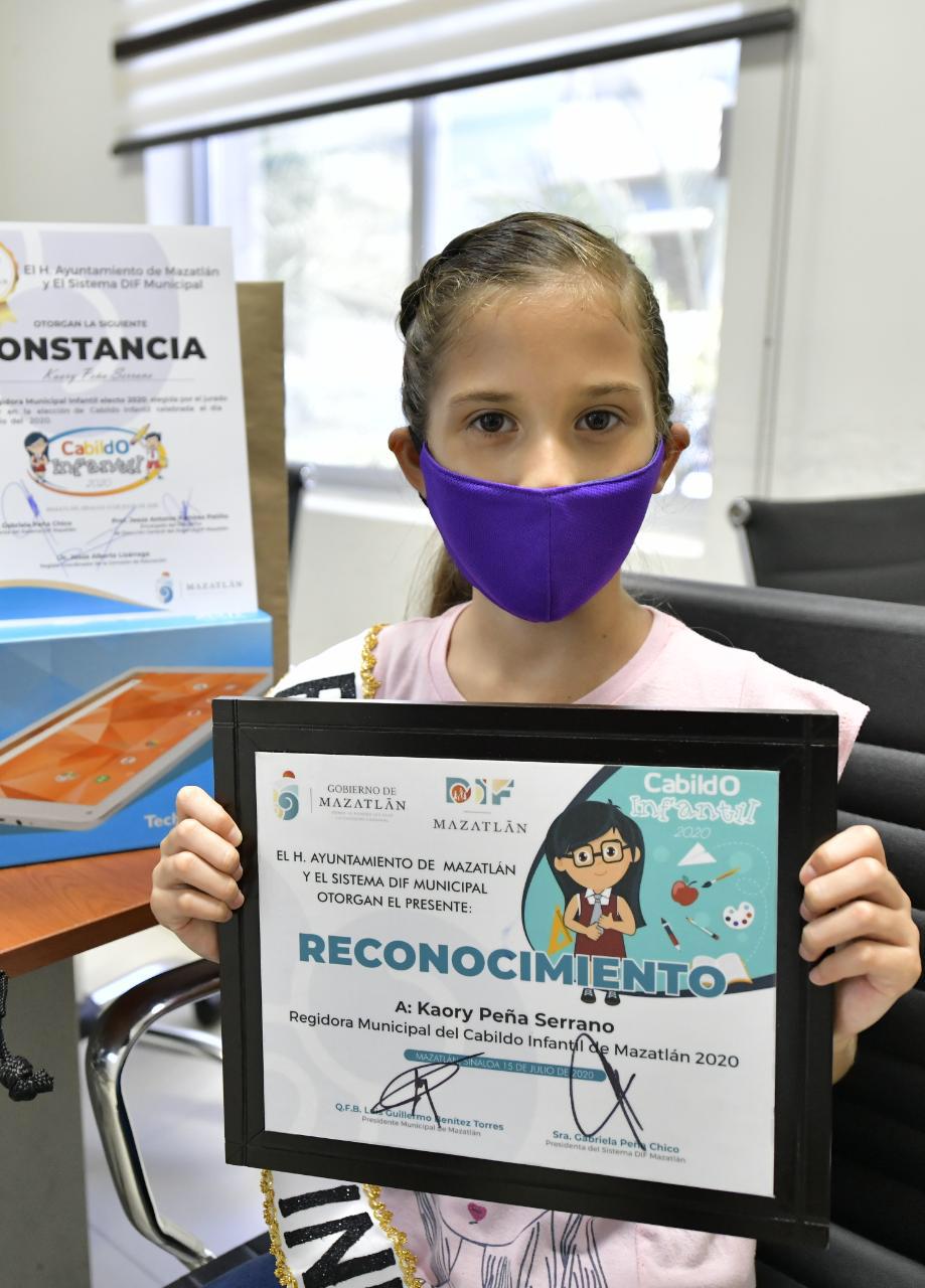 Kaory Peña Serrano recibió esta mañana su banda y constancia como Regidora del Cabildo Infantil 2020, de parte de su homólogo, el Edil Felipe de Jesús Velarde Sandoval.