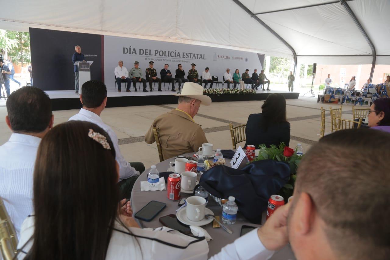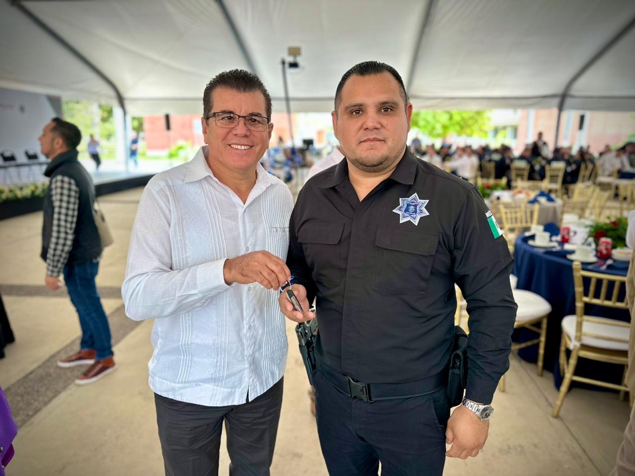 Mazatlán, Sinaloa, 13 de diciembre de 2023.- En el marco del festejo del Día del Policía, realizado en las instalaciones de la Universidad del Policía en la capital del estado, el Gobernador Rubén Rocha Moya entregó simbólicamente 6 patrullas equipadas a Edgar González, Alcalde de Mazatlán.