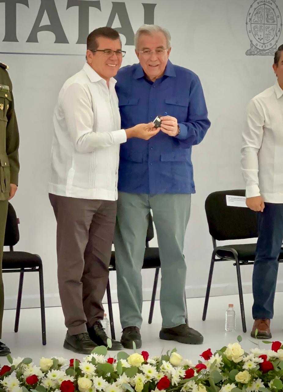 El Gobernador Rubén Rocha Moya entregó simbólicamente los vehículos a Edgar González.