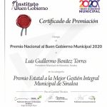 De los más de 200 municipios que participaron en la convocatoria 2020, Mazatlán es una de las tres alcaldías del país en recibir el Premio Estatal a la Mejor Gestión Integral Municipal de Sinaloa, y el único de Sinaloa en recibir este galardón.