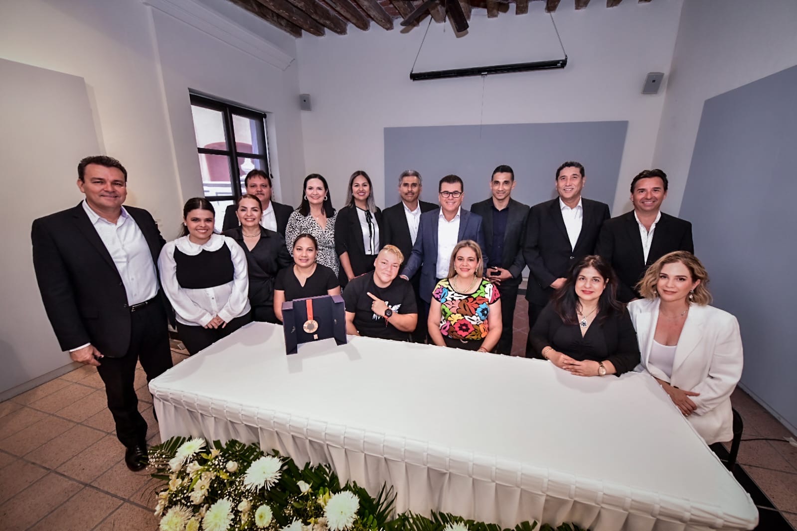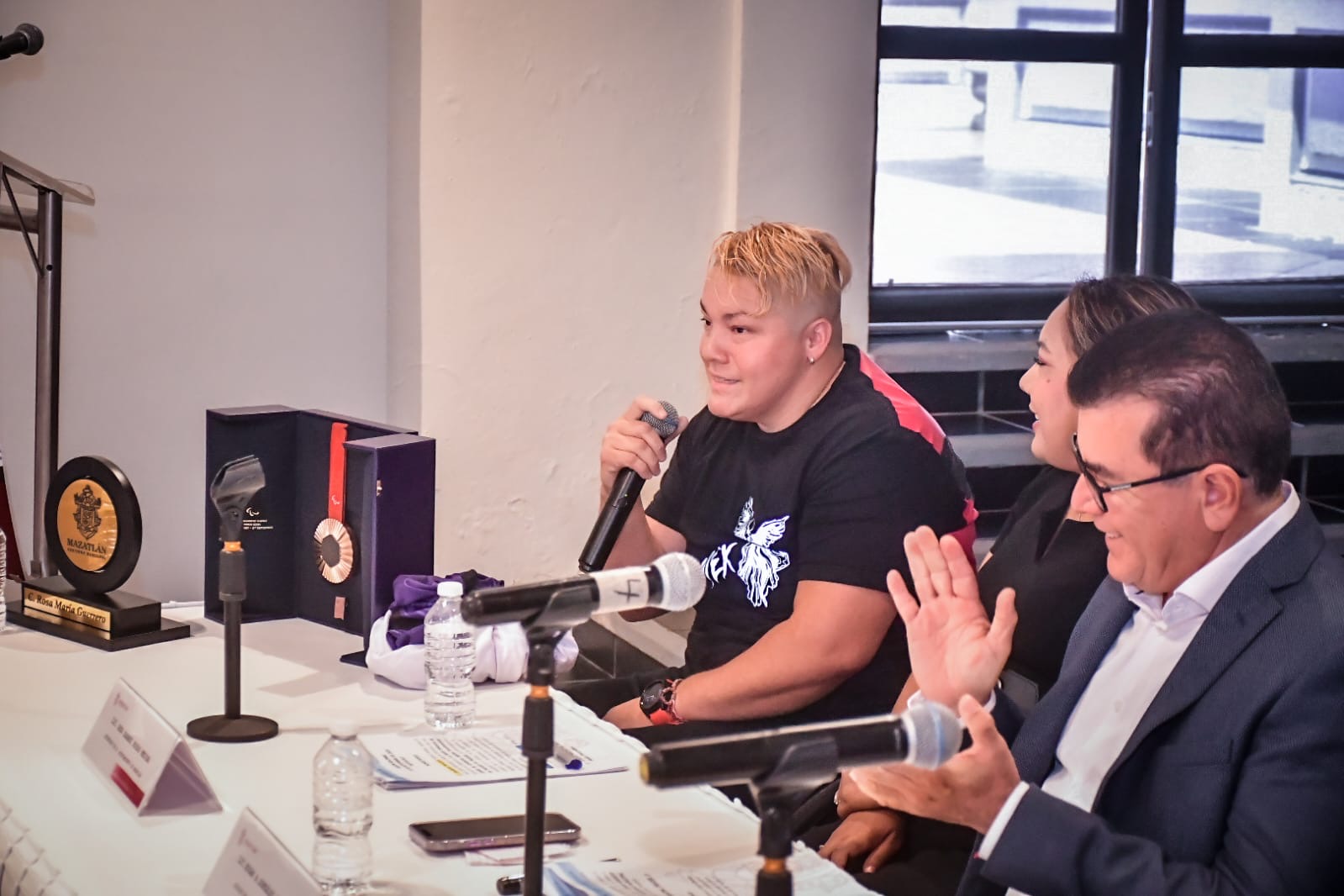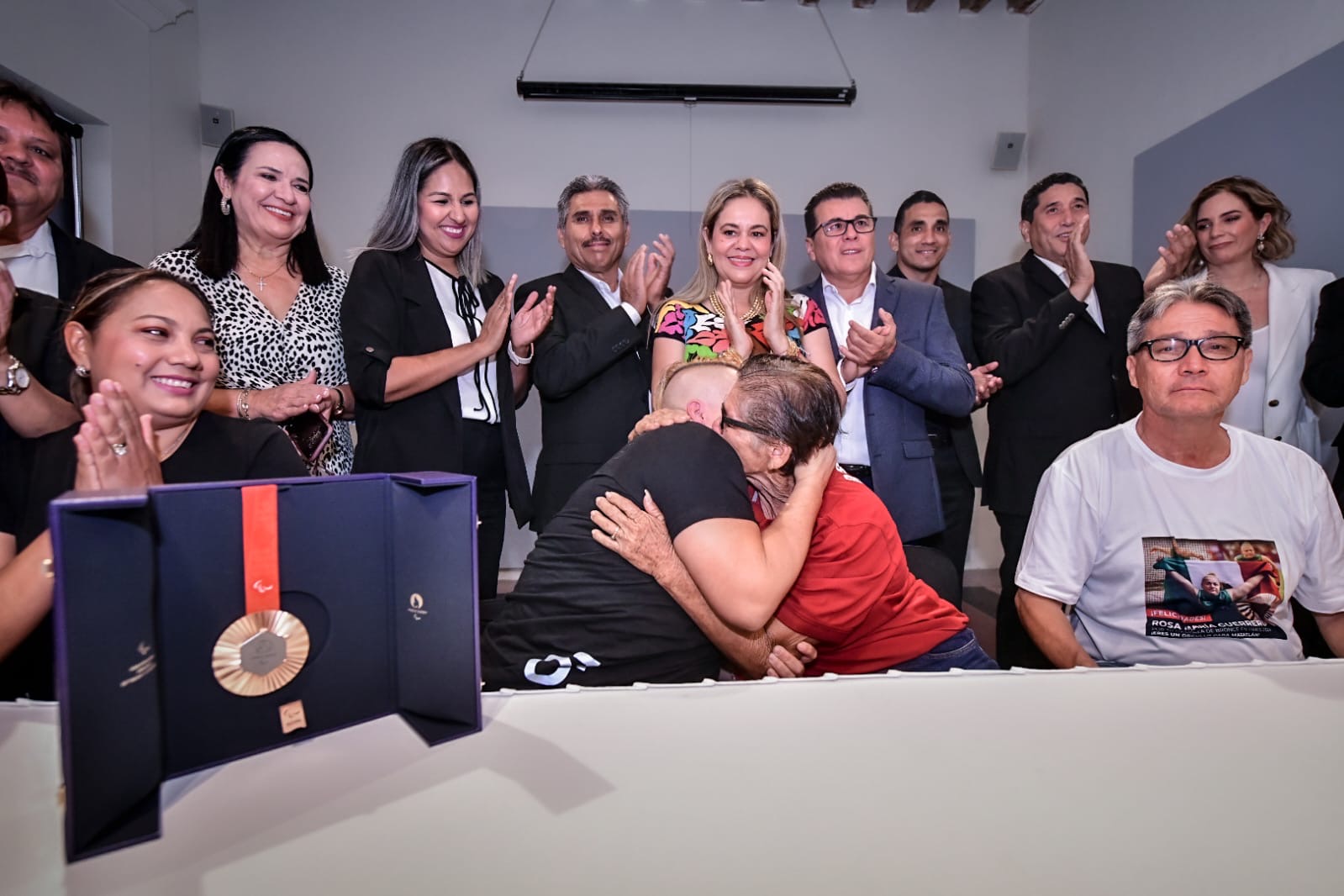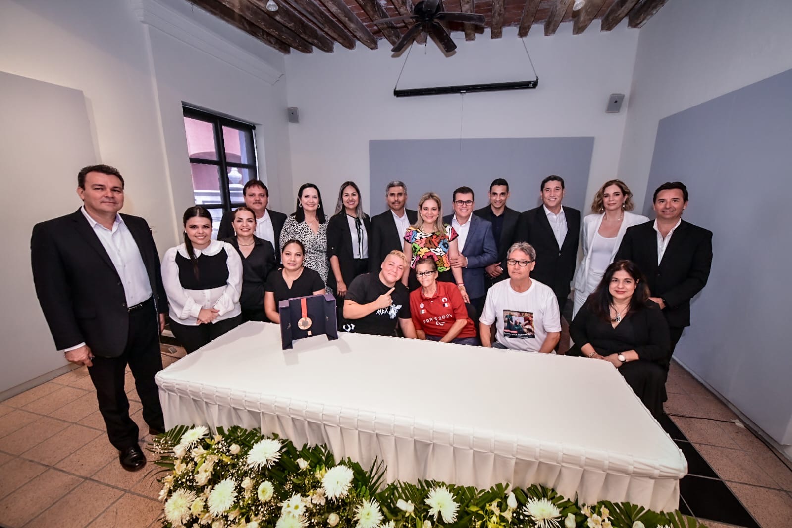Mazatlán, Sinaloa a 10 de septiembre de 2024.- Regidores y el Presidente Municipal de Mazatlán, Édgar González, realizaron un reconocimiento a la medallista de bronce de los Juegos Paralímpicos de París 2024, Rosa María Guerrero Cázares, en la Galería del Teatro Ángela Peralta.