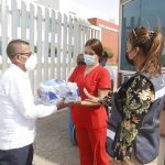 Acompañado de la encargada del despacho de la dirección de DIF Mazatlán, Dora Luz Camacho, el edil entregó botellas de agua a los adultos mayores que esperaban turno.