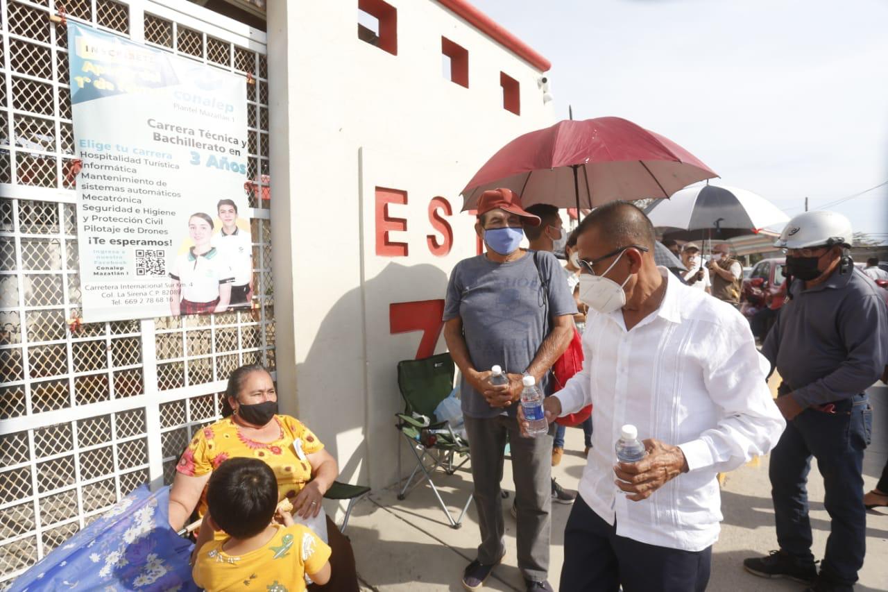 Acompañado de la encargada del despacho de la dirección de DIF Mazatlán, Dora Luz Camacho, el edil entregó botellas de agua a los adultos mayores que esperaban turno.