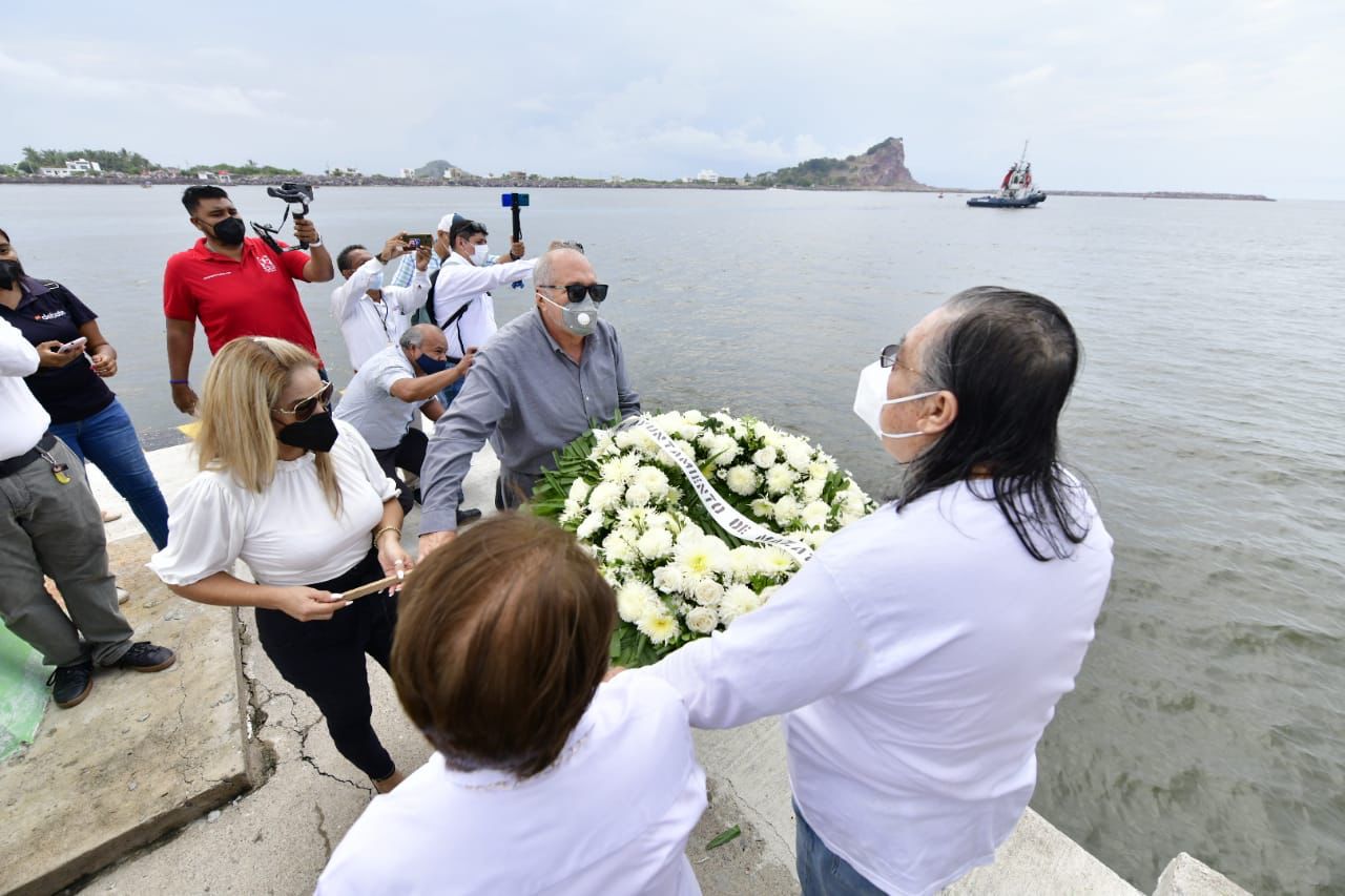 El Alcalde Luis Guillermo Benitez Torres encabezó la emotiva ceremonia acompañado de los regidores Ricardo Michel Luna y María Isabel Gamboa González, así como Jacqueline Cisneros González, hija de los uno de los marineros fallecidos en la tragedia.