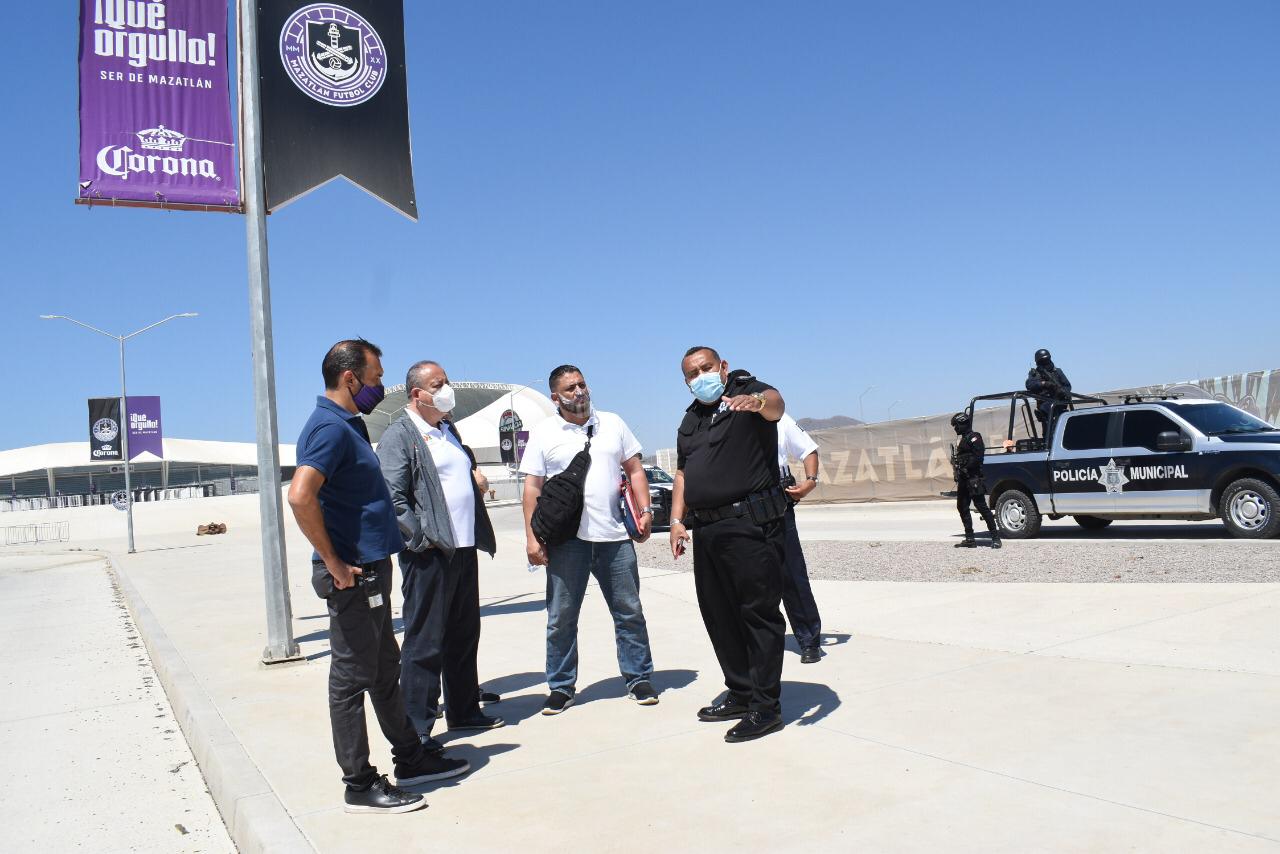 Mazatlán.- El Secretario de Seguridad Pública y Tránsito Municipal, Juan Ramón Alfaro Gaxiola, participó este jueves en la reunión para definir el operativo especial de vigilancia que se implementará en El Kraken, con motivo del juego entre el equipo local Mazatlán FC y el Club América a realizarse este viernes.