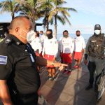 Junto al Monumento al Pescador, elementos de Tránsito Municipal, del Escuadrón de Salvamento Acuático, del grupo Capta Leopardo y de la Policía Ciclista se reunieron a temprana hora para recibir instrucciones sobre las acciones que estarán reforzando y que contempla el respeto a los protocolos sanitarios.