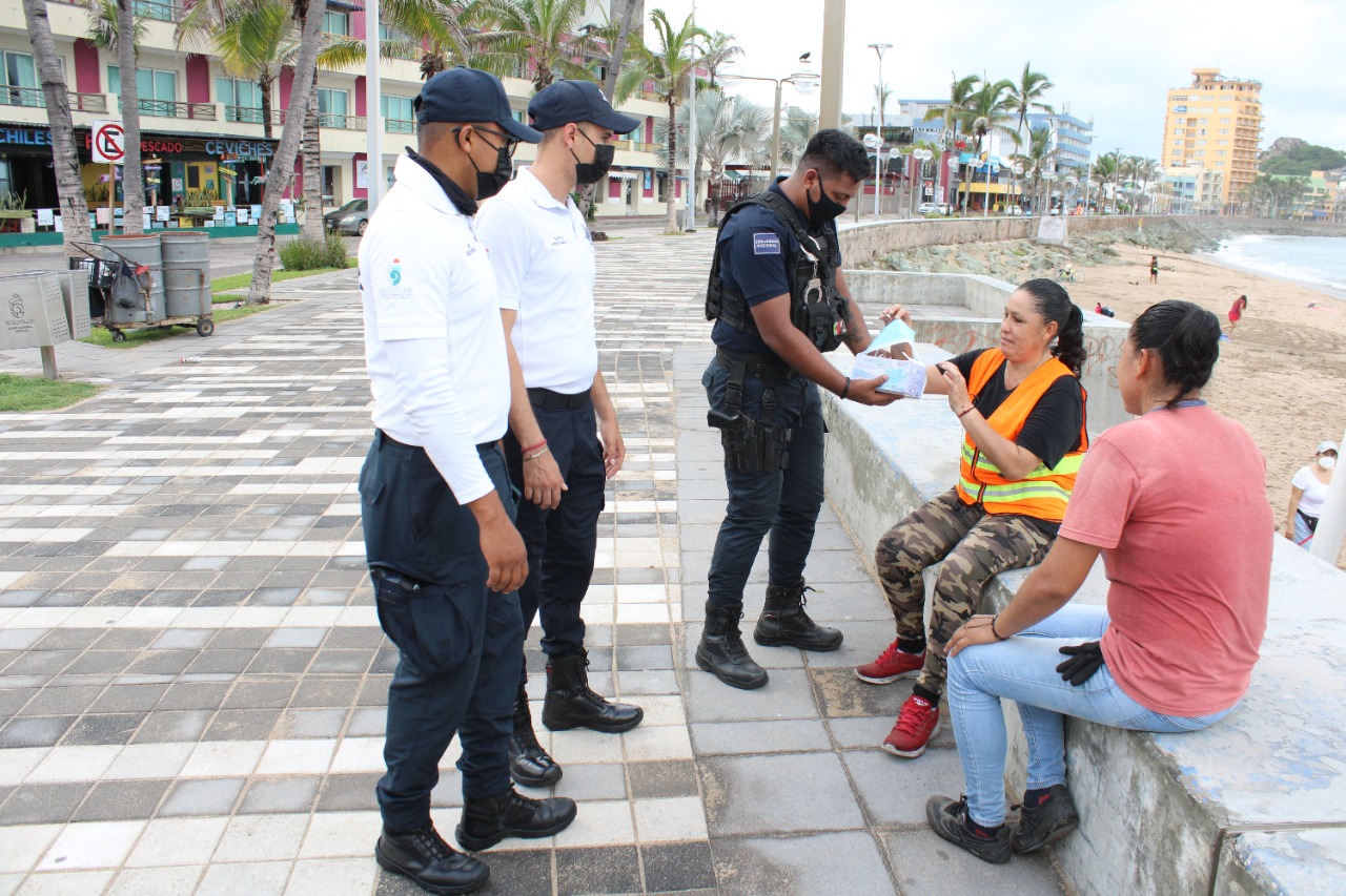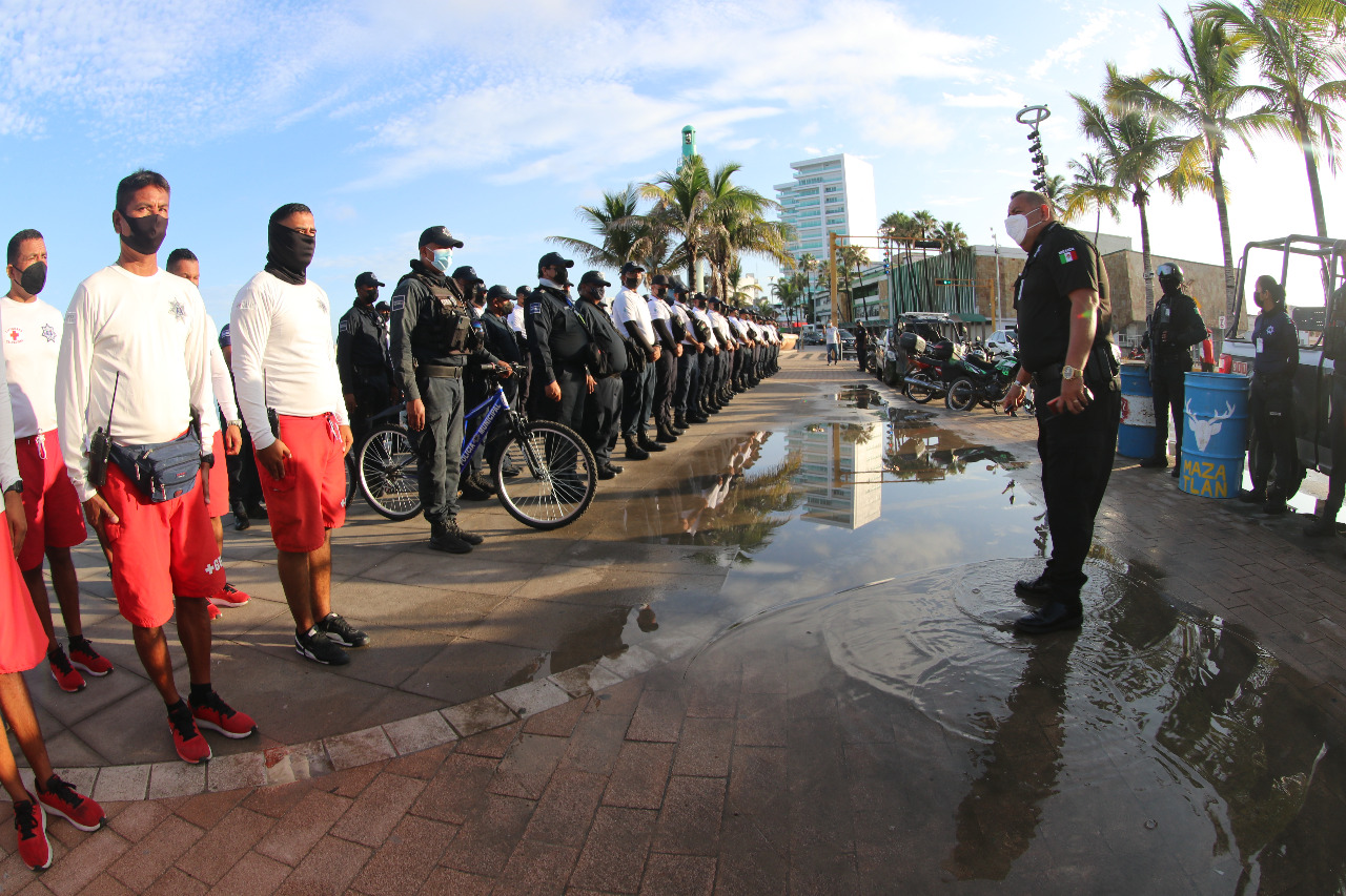 Junto al Monumento al Pescador, elementos de Tránsito Municipal, del Escuadrón de Salvamento Acuático, del grupo Capta Leopardo y de la Policía Ciclista se reunieron a temprana hora para recibir instrucciones sobre las acciones que estarán reforzando y que contempla el respeto a los protocolos sanitarios.