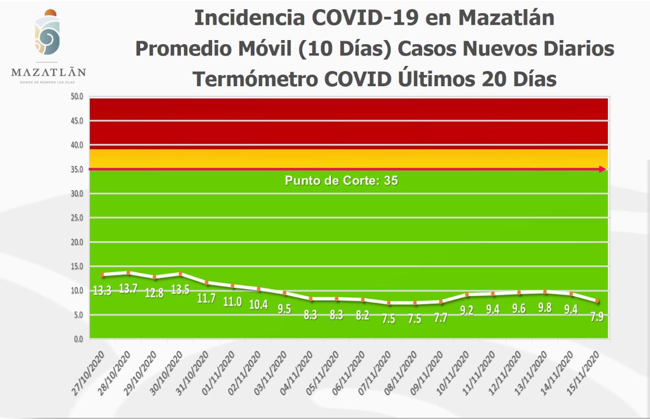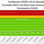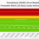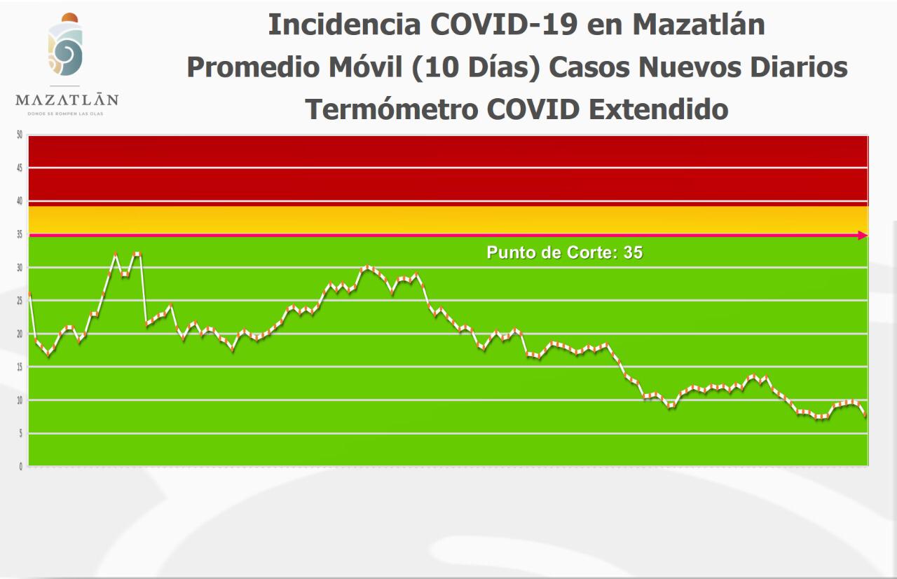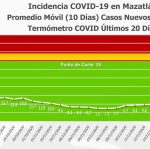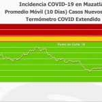 En el Termómetro de Casos Activos Diarios, con un promedio móvil de los últimos 10 días, Mazatlán sigue a la baja y este día tiene 53. Con estas cifras, Mazatlán sigue en semáforo verde con muy bajo riesgo de contagio comunitario.
