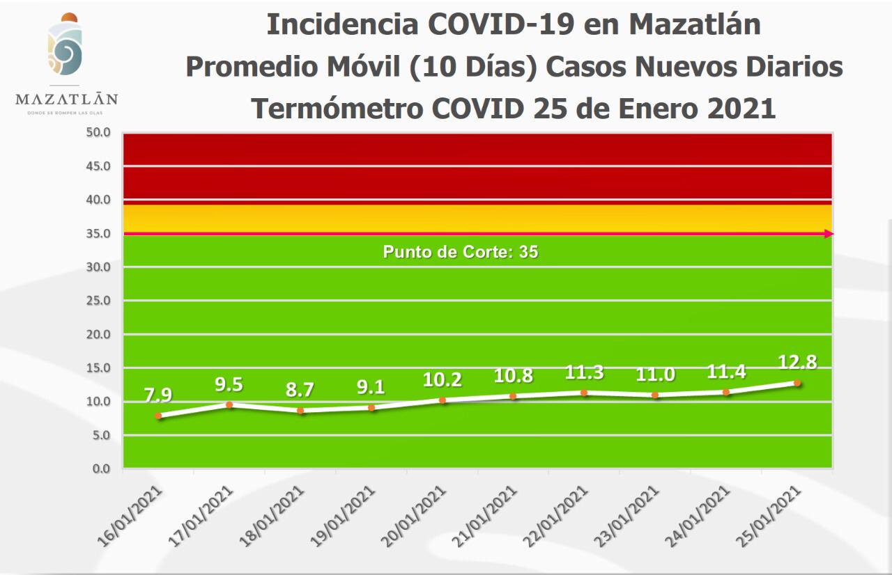 Mencionó que el Termómetro de Casos Nuevos Diarios, que el Gobierno Municipal emplea para medir la incidencia de la pandemia en el puerto, hoy se ubicó en los 12.8 grados Covid, promedio de los 10 últimos dias.