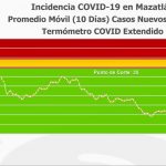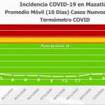 El de Casos Nuevos Diarios con un promedio móvil de 10 días, presenta un ligero incremento y se ubica en 9.6 grados, sin embargo, Mazatlán está muy alejado del riesgo de contagios comunitarios.