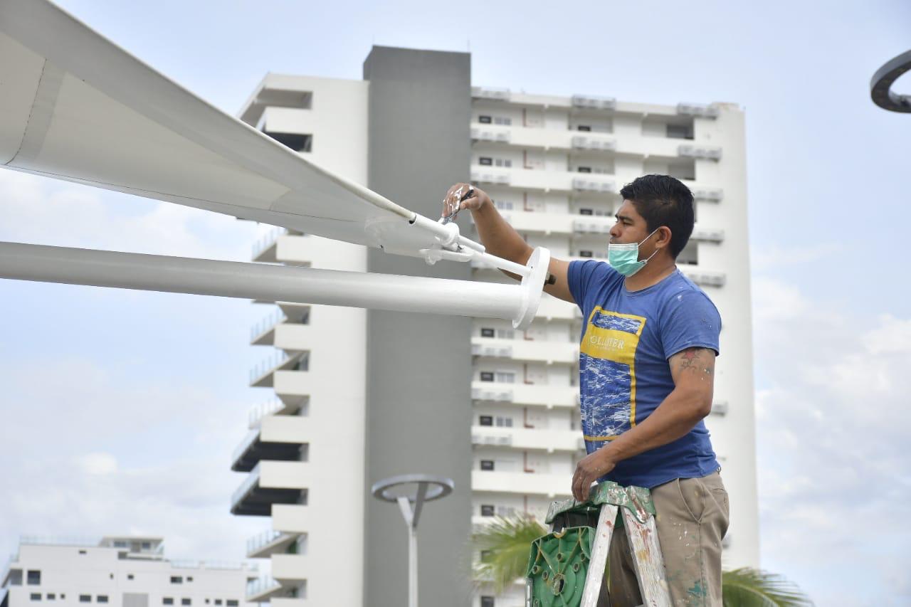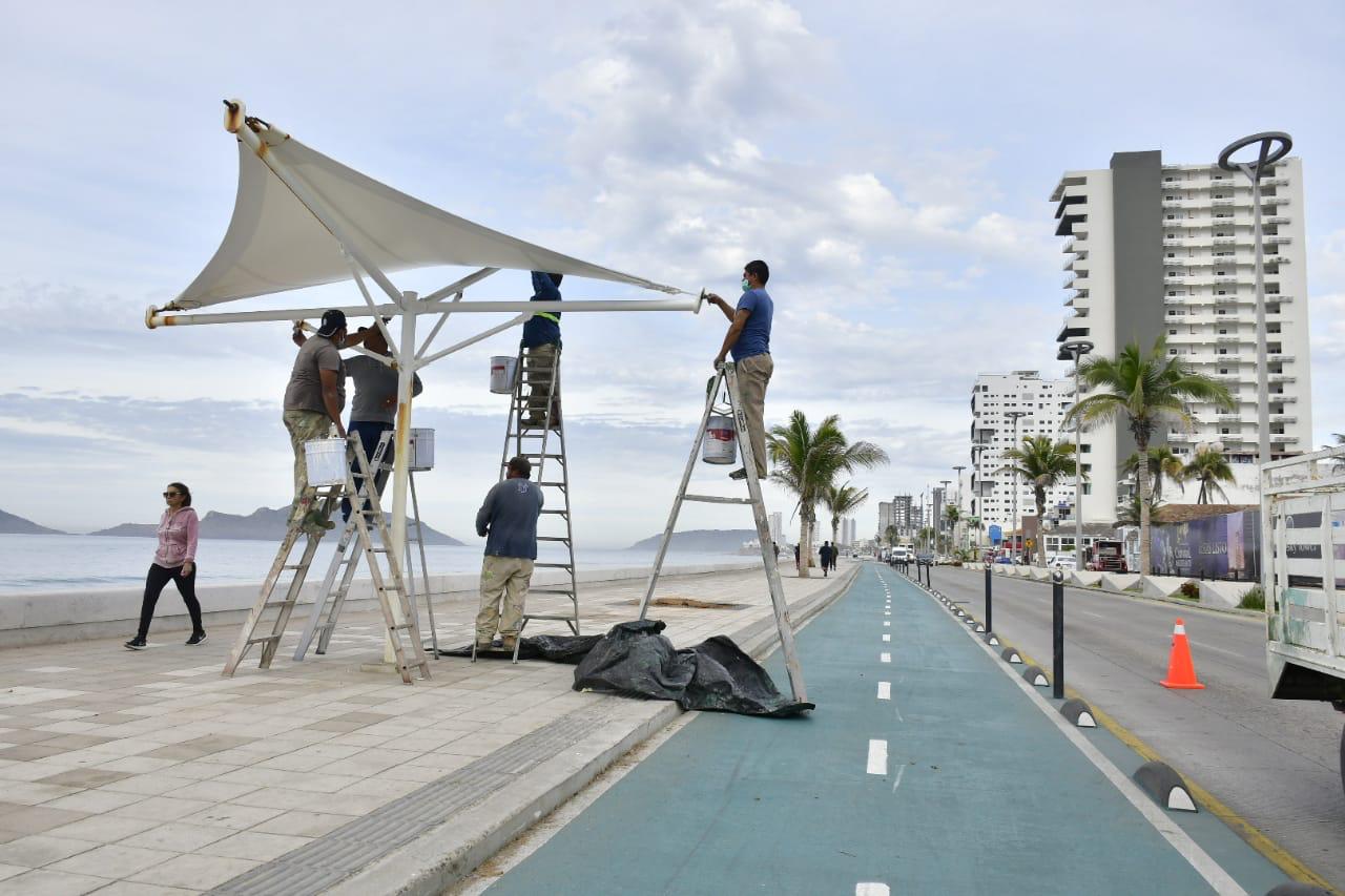 Juan de Dios Garay Velázquez, Director de Obras Públicas, dijo que se están llevando a cabo trabajos de pintura en las estructuras metálicas de 36 velarias distribuidas a lo largo del malecón y otras acciones que comenzaron a realizar desde el pasado jueves 14 de enero.