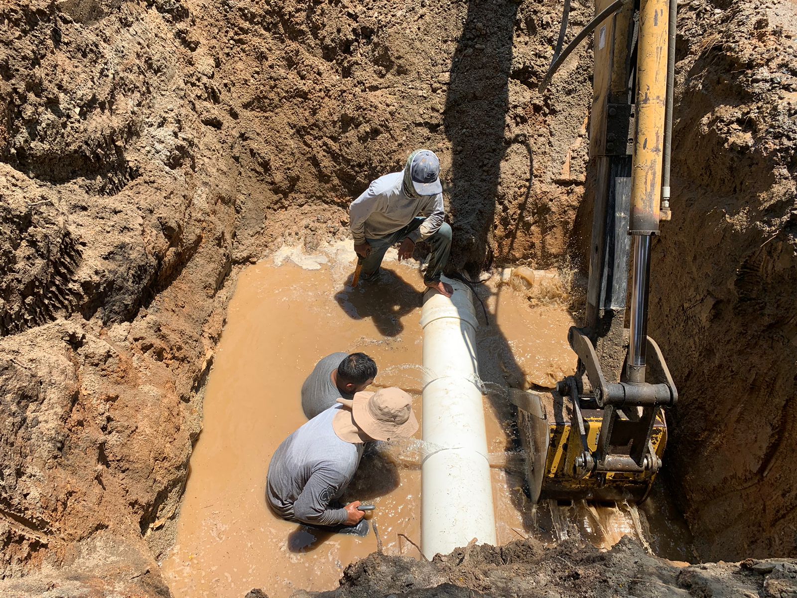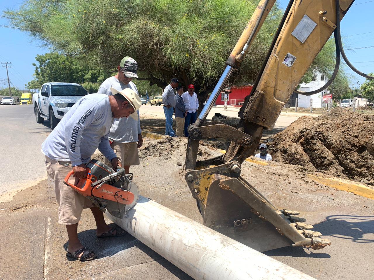 Mazatlán, Sinaloa a 29 de mayo de 2023.- Bajo la coordinación de los Departamentos de Producción y de Pozos y Tanques, este lunes, personal de la Gerencia de Operaciones de Jumapam reparó un daño detectado en la línea de presión 14 pulgadas, en las inmediaciones de la Colonia Valles del Ejido.