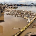 La barrera artesanal que sirve para contener los desechos que avanzan hacia el mar desde el Estero del Infiernillo, este día retuvo material plástico como vasos, platos y envases; «cascarones» de refrigeradores y estufas, poliestireno, madera y hojas secas, detalló la funcionaria.