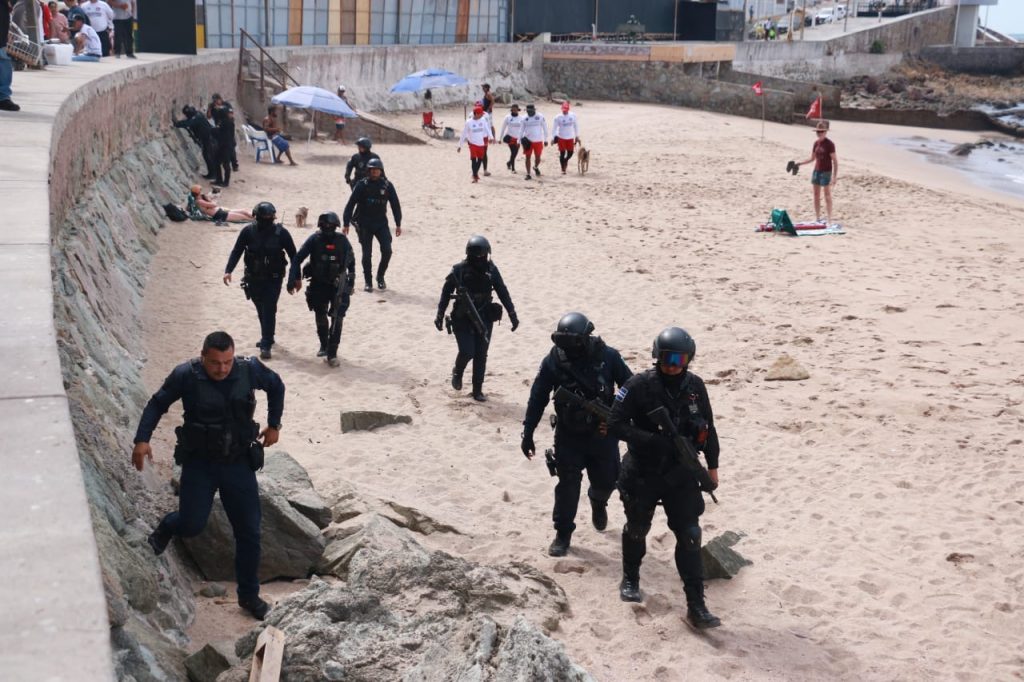 Mazatlán, Sinaloa 9 de Febrero de 2024.- Priorizando la seguridad de los asistentes a la zona de Olas Altas cuya actividad inicia con mayor afluencia la noche del viernes, la Secretaría de Seguridad Pública municipal, en coordinación con agentes de la Policía Estatal Preventiva y la personal de Protección Civil realizaron el tradicional barrido a fin de detectar y retirar posibles artículos punzo cortantes que pudieran ser utilizados como arma.