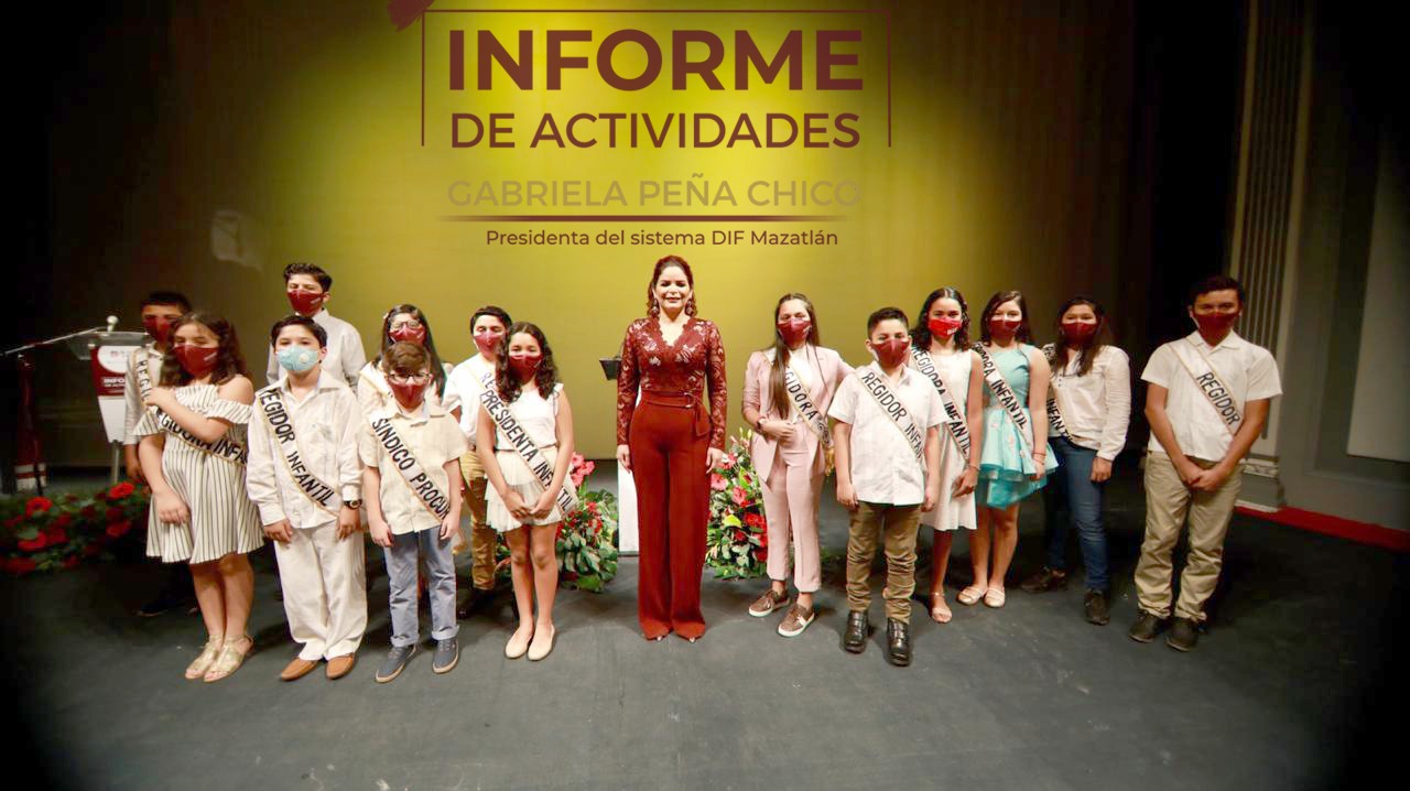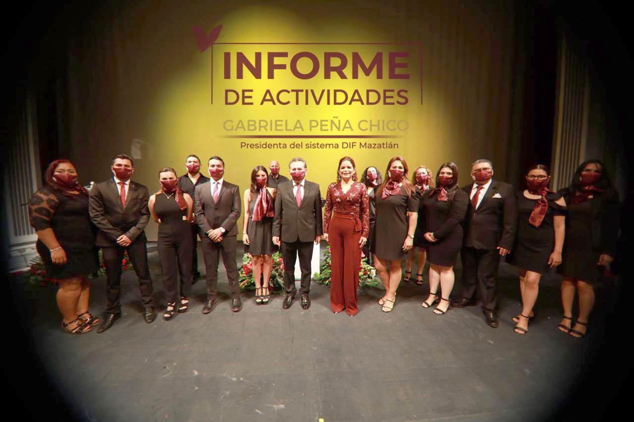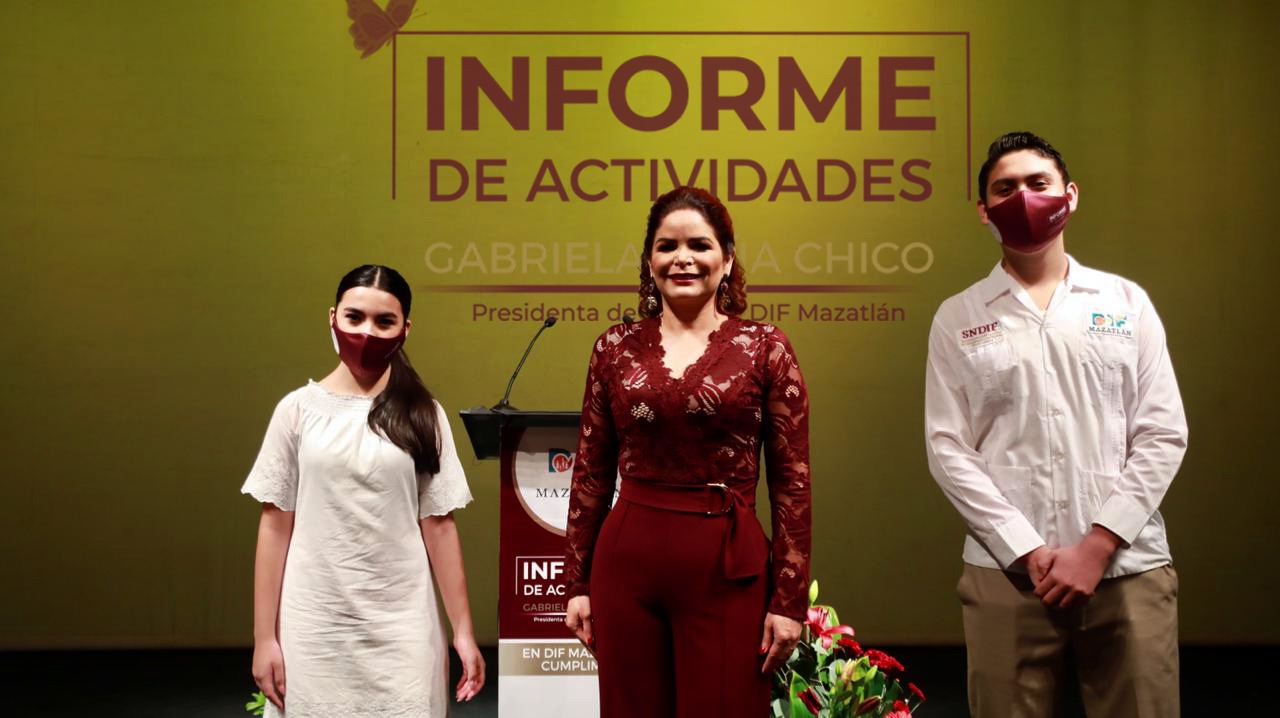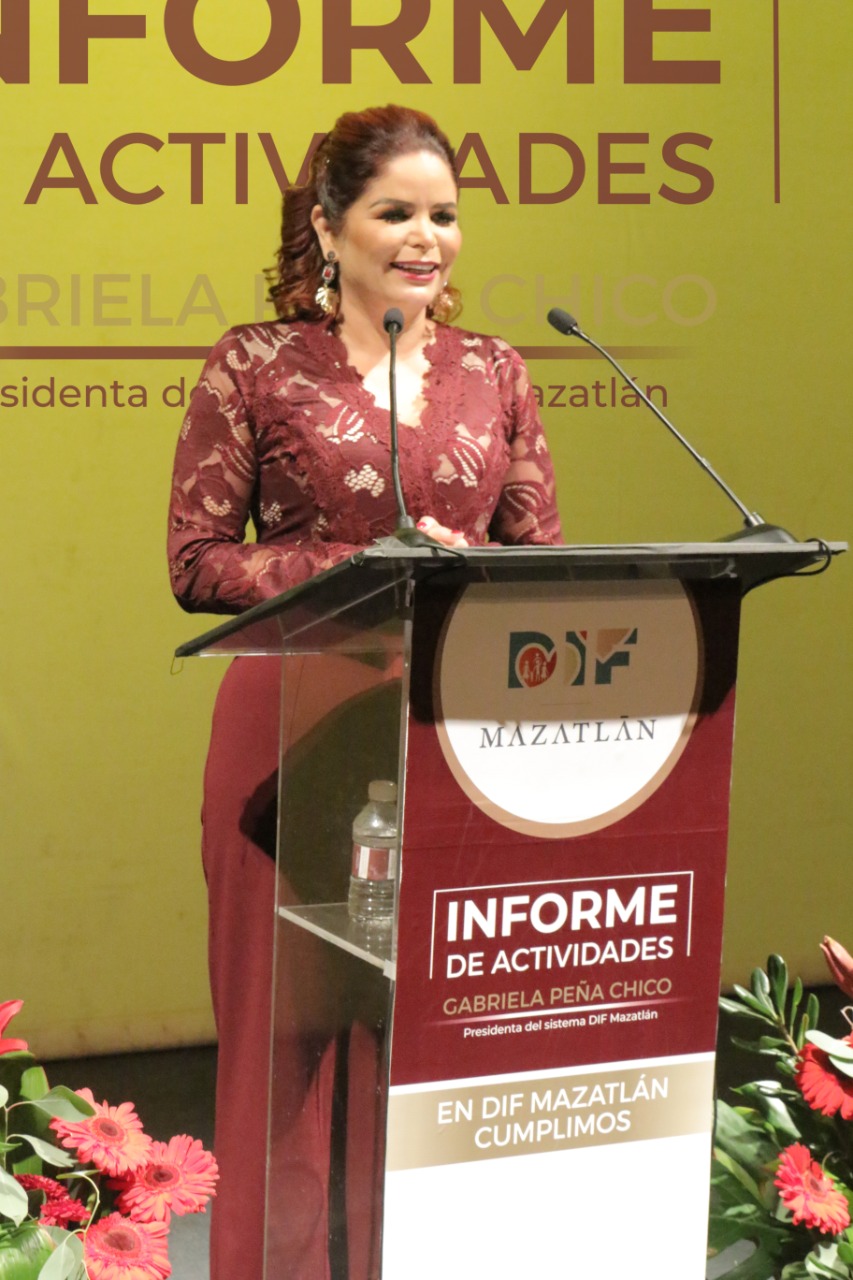 Mazatlán. – Una ciudad de oportunidades, respeto e inclusión destacó como ejes de su labor Gabriela Peña Chico al frente del Sistema DIF Municipal, durante la presentación de su informe de actividades desde 2018 en favor de las familias más vulnerables de Mazatlán.
