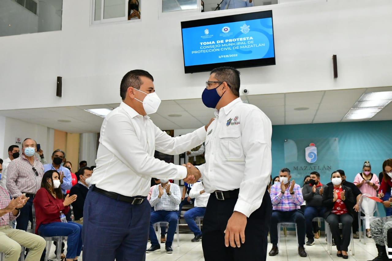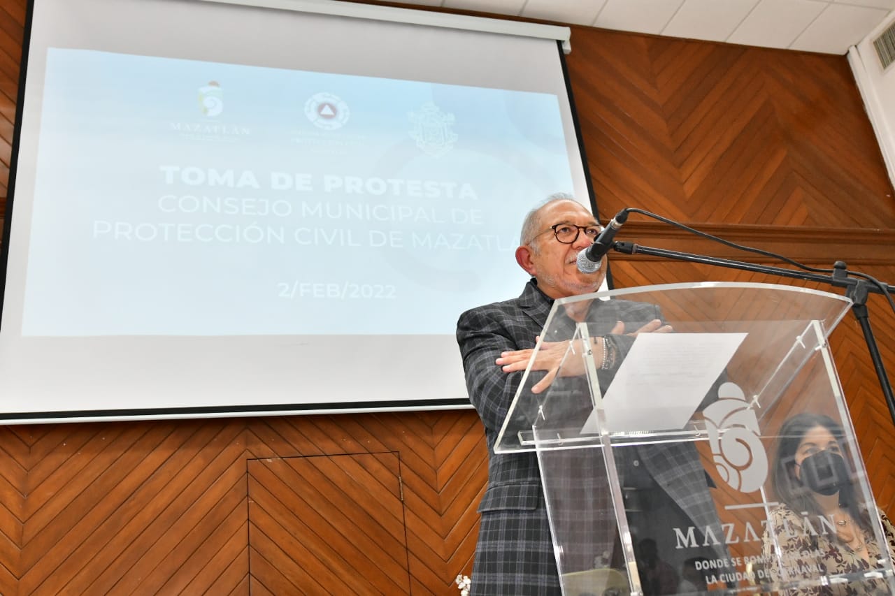 Mazatlán.- El Alcalde Luis Guillermo Benítez Torres tomó la protesta a integrantes del Consejo Municipal de Protección Civil, cuyo objetivo es salvaguardar las vidas humanas, bienes y el entorno en que viven, labor que realizan de manera coordinada con los tres niveles de gobierno y organismos camarales.
