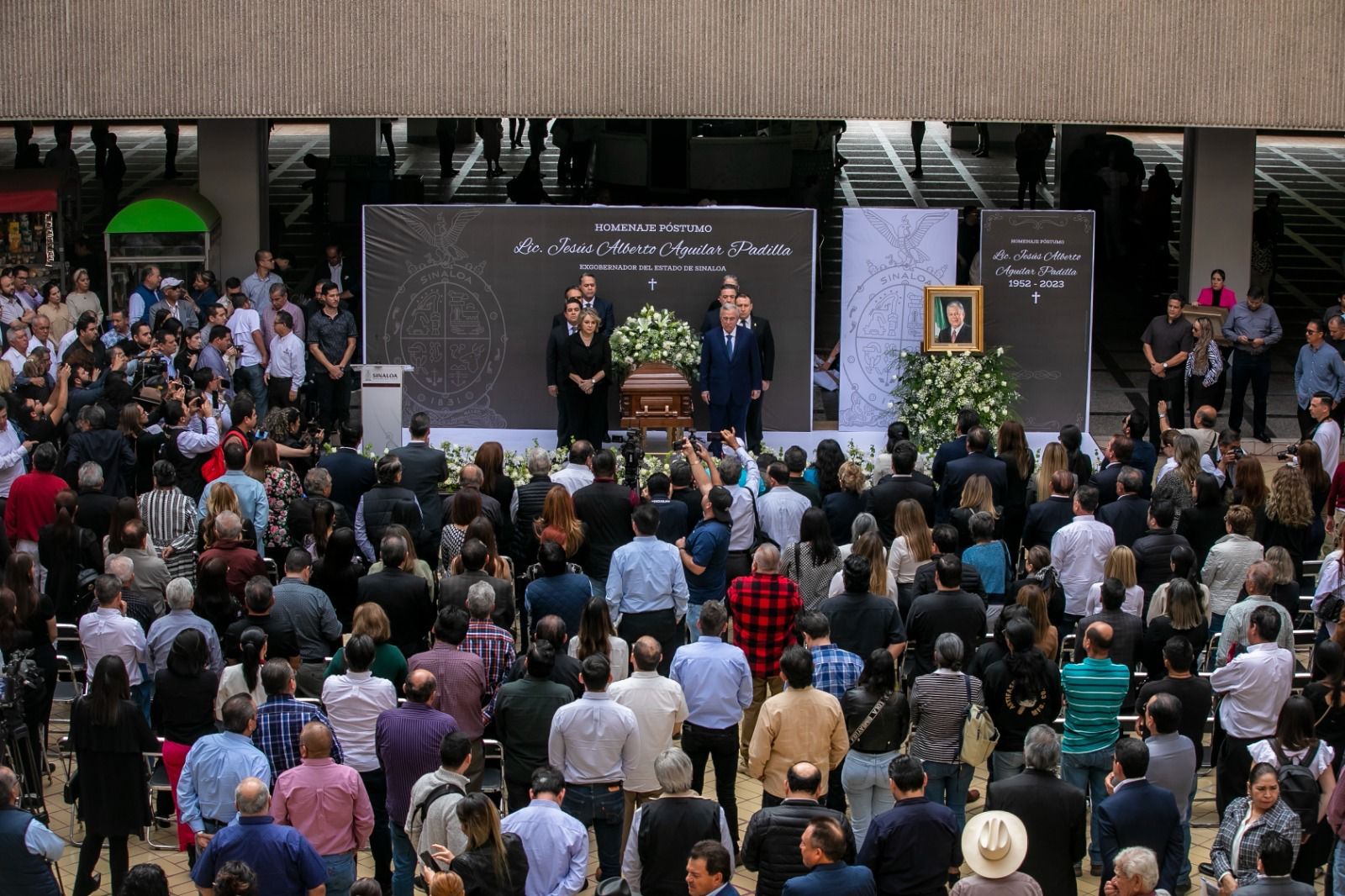 Culiacán, Sinaloa, a 31 de enero del 2023.- El patio central de Palacio de Gobierno fue el escenario donde se rindió un homenaje póstumo de cuerpo presente al ex gobernador Jesús Aguilar Padilla, ceremonia durante la cual el gobernador Rubén Rocha Moya recordó que el ex mandatario siempre fue fiel a sus principios, un hombre público honesto a toda prueba y que supo cumplirle a Sinaloa, y a su familia.