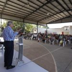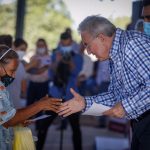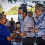 El Pozole, Rosario, Sinaloa, a 24 de noviembre de 2021.- Un doble beneficio para cientos de habitantes del municipio de Rosario llevó el gobernador Rubén Rocha Moya al visitar El Pozole, donde hizo entrega de apoyos económicos para damnificados del huracán «Pamela» y en Cajón Verde inició una obra que solucionará la falta de agua potable que cada año padecen sus habitantes.