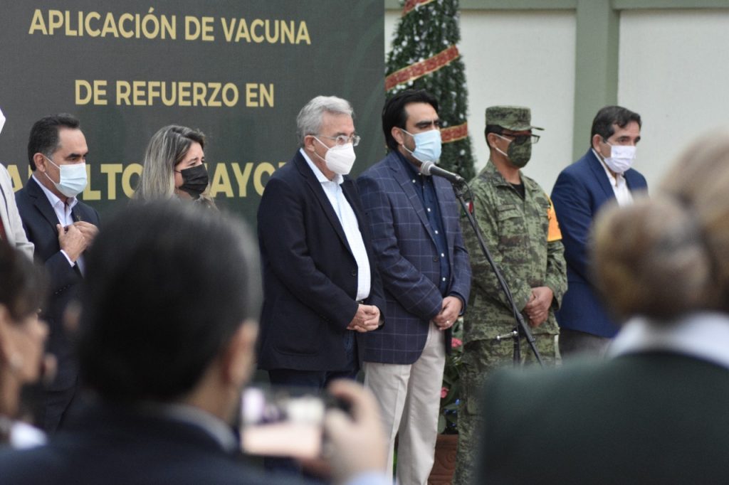 Culiacán, Sinaloa, a 7 de diciembre de 2021. – Al poner en marcha la aplicación del tercer refuerzo de la vacuna contra el COVID para adultos mayores, el gobernador Rubén Rocha Moya, agradeció al presidente de la República, Andrés Manuel López Obrador, el que Sinaloa haya sido incluido junto con otros cuatro estados para iniciar esta nueva etapa de vacunación, que estará dirigida para personas de 60 años y más, a quienes se les aplicará la dosis de AstraZeneca, independientemente de la vacuna que hayan recibido en sus primeras dos dosis.