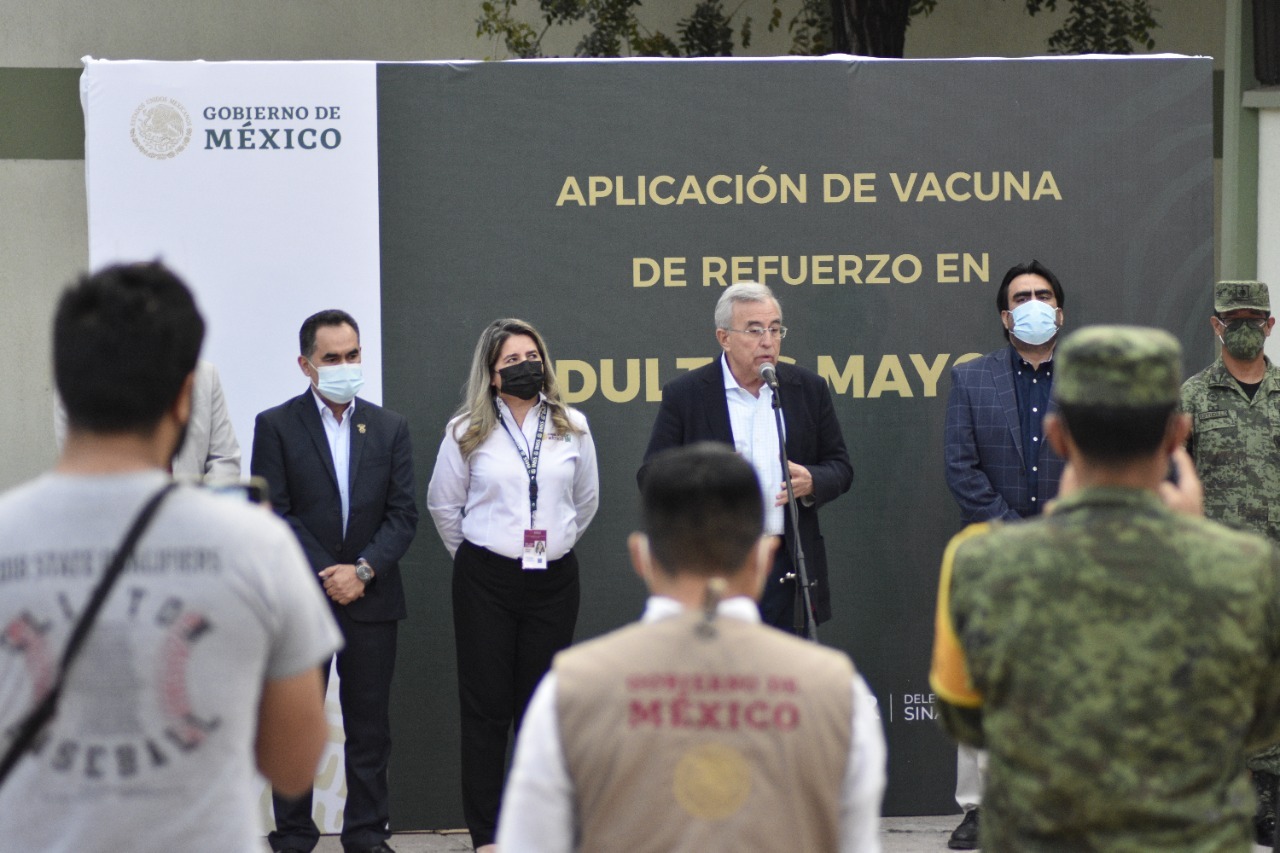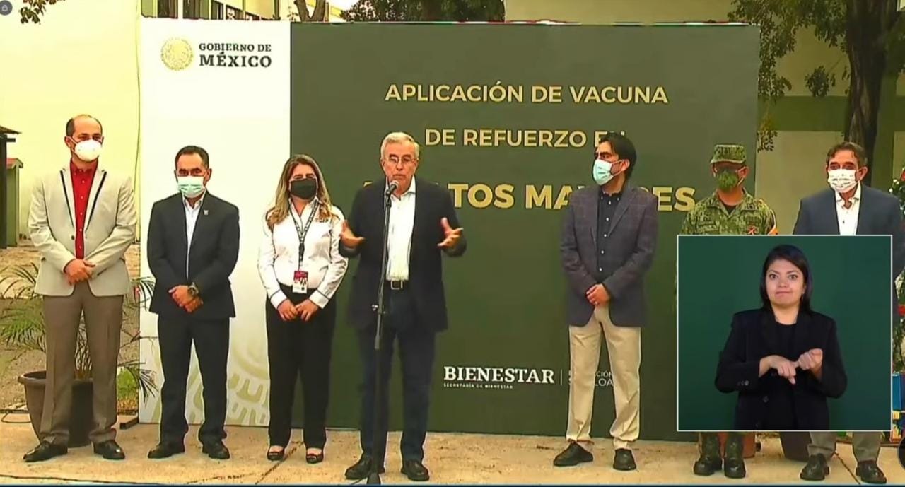 Culiacán, Sinaloa, a 7 de diciembre de 2021. – Al poner en marcha la aplicación del tercer refuerzo de la vacuna contra el COVID para adultos mayores, el gobernador Rubén Rocha Moya, agradeció al presidente de la República, Andrés Manuel López Obrador, el que Sinaloa haya sido incluido junto con otros cuatro estados para iniciar esta nueva etapa de vacunación, que estará dirigida para personas de 60 años y más, a quienes se les aplicará la dosis de AstraZeneca, independientemente de la vacuna que hayan recibido en sus primeras dos dosis.