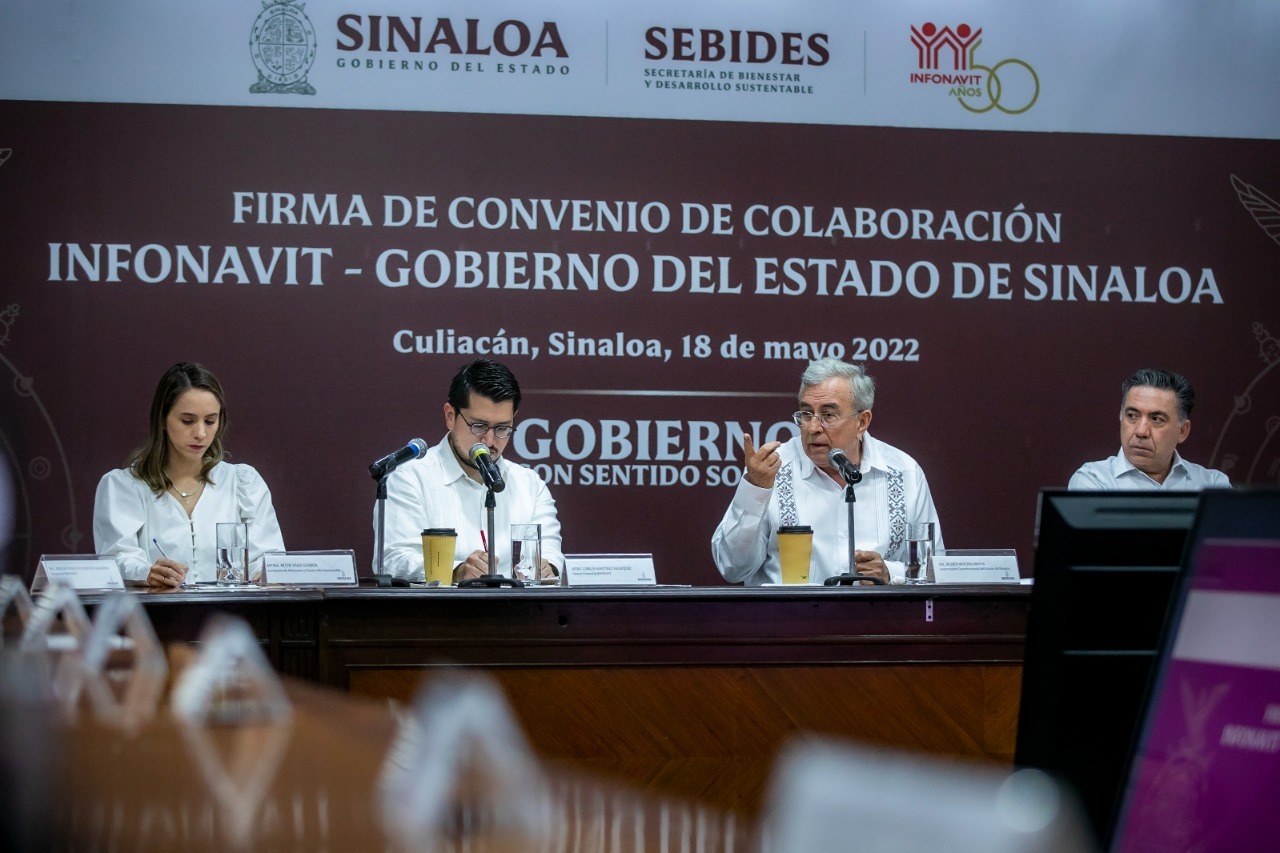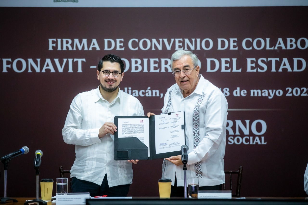 Culiacán, Sinaloa, a 18 de mayo del 2022.- Como un convenio de gran contenido social, calificó el gobernador Rubén Rocha Moya el Convenio de Colaboración que signó con el director del Infonavit, Carlos Martínez Velázquez, porque tiene que ver con la protección del patrimonio más importante de cualquier familia, como es su vivienda y la posibilidad de adquirir una para quienes carecen de ella.