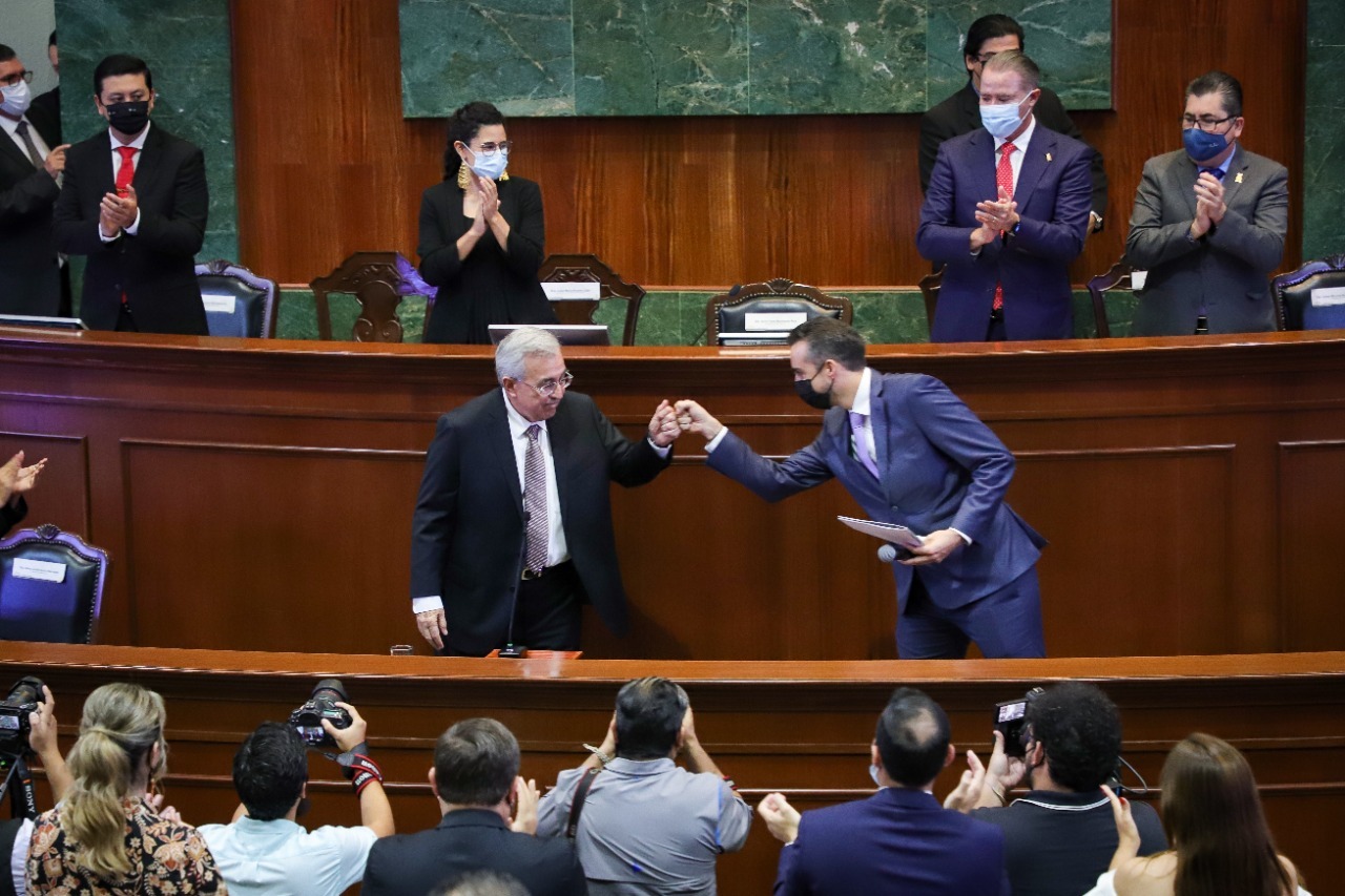 Después de escuchar la magistral interpretación, Rocha Moya emitió un emotivo saludo a todas y todos los ciudadanos sinaloenses presentes en el recinto legislativo y conectados a través de las redes sociales, y dio las gracias por su presencia a los invitados especiales con referencias personales hacia cada uno.