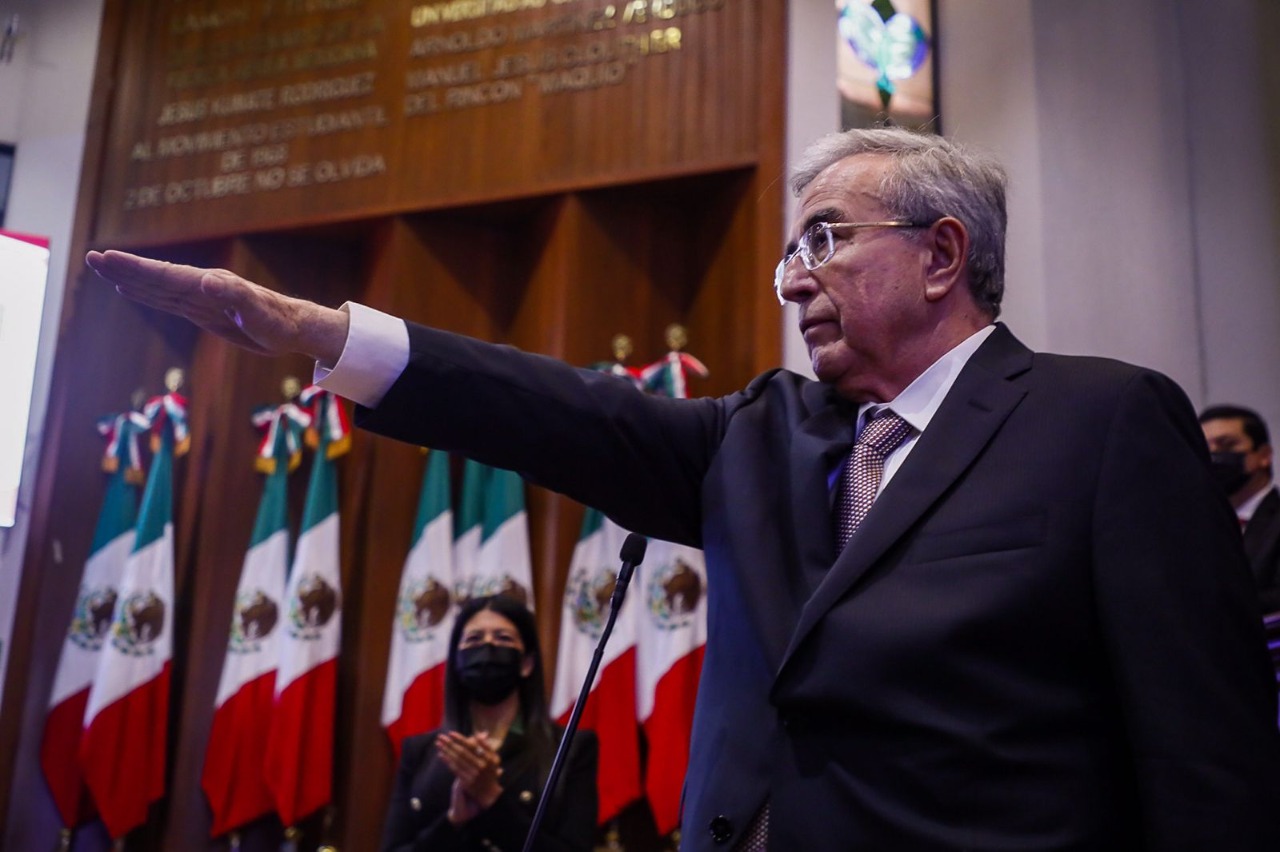 Culiacán, Sinaloa, domingo 31 de octubre de 2021. Tras rendir protesta como gobernador constitucional del estado de Sinaloa ante el Congreso del Estado, Rubén Rocha Moya le imprimió a la ceremonia su peculiar estilo de expresar tanto sus agradecimientos, como sus principios y compromisos, propiciando un ambiente de justo balance entre la solemnidad y la calidez.