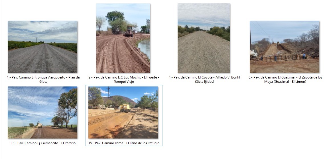 También la pavimentación del camino Entronque Aeropuerto-Plan de Guadalupe en Ahome, tiene avance del 40 por ciento y se destinan 9 millones 309 mil pesos, el del Llano de los Refugio en Cosalá en donde se destinan 15 millones 833 mil pesos, tiene un avance del 25 por ciento, el del Guasimal-Zapote de los Moya en Mocorito donde se pavimentan 4 kilómetros con recursos por 36 millones 48 mil pesos, el avance es del 23 por ciento.