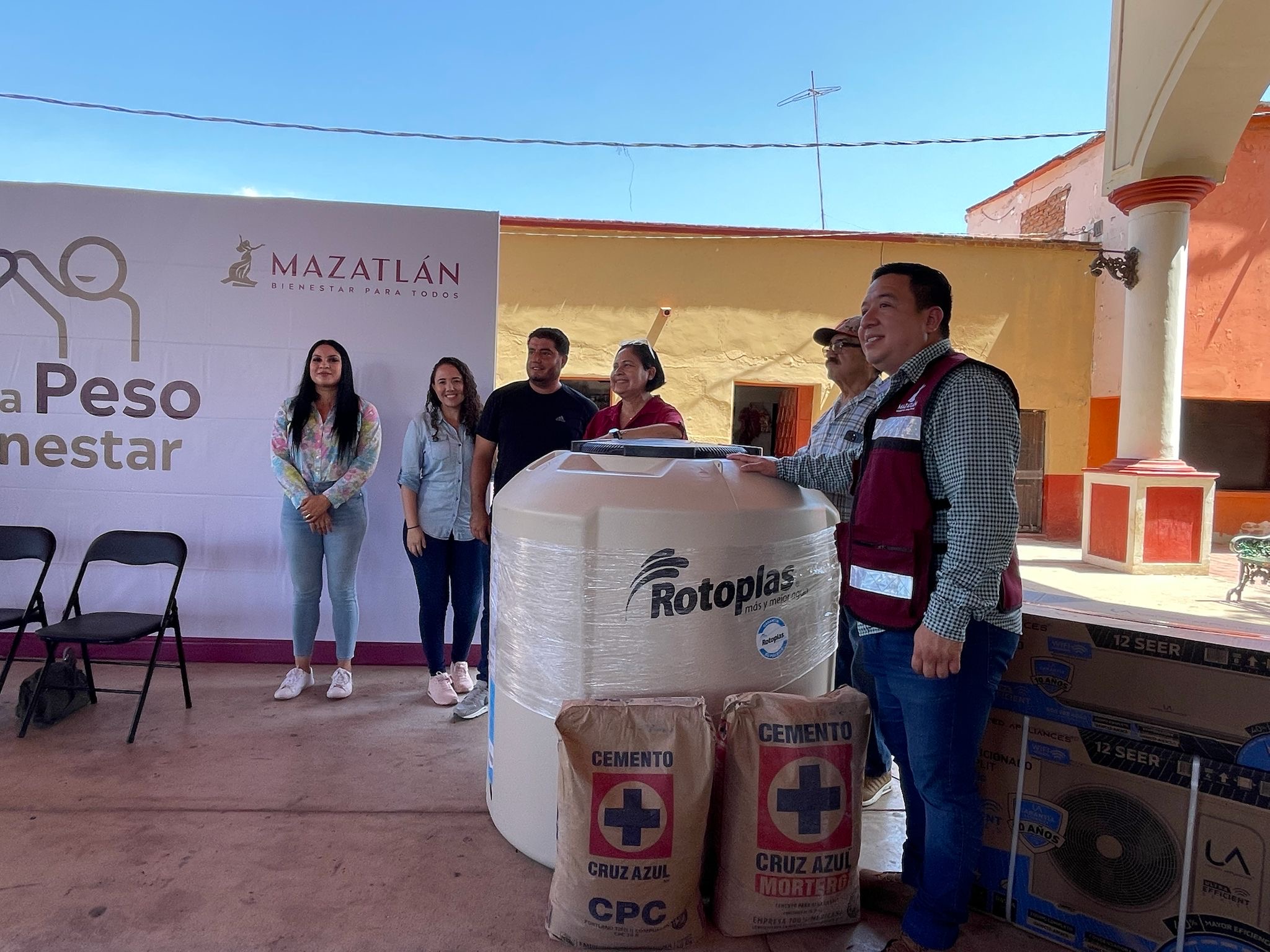 Este jueves, se entregaron 492 sacos de cemento, 130 sacos de mortero, 2,630 blocks, 40 electrodomésticos, 6 tinacos y 24 minisplits, con una inversión total de 662 mil 523 pesos.