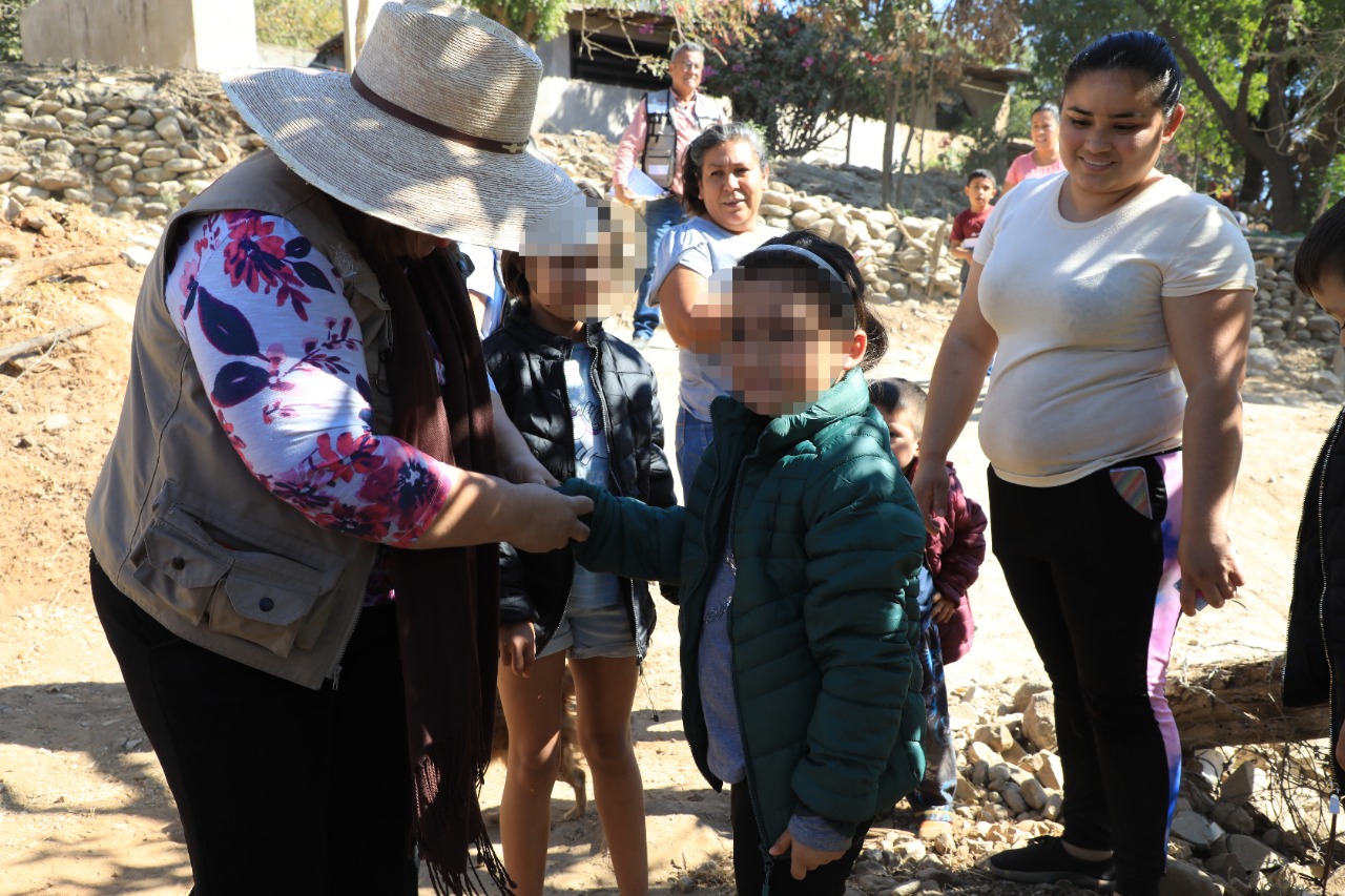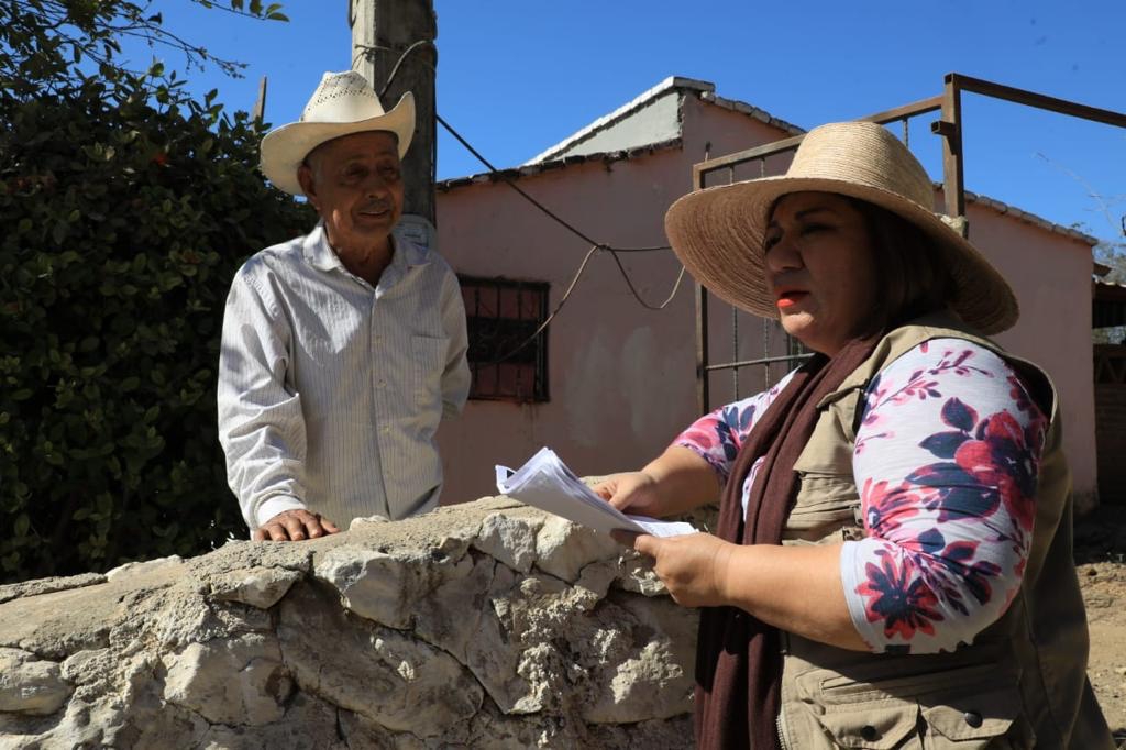 La titular de SEBIDES, María Inés Pérez Corral, visitó la comunidad para entregar los apoyos casa por casa