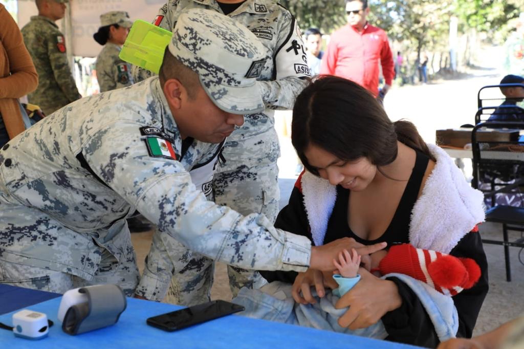 La secretaria Pérez Corral acudió primeramente al puesto de labor social que el Ejército Mexicano y la Guardia Nacional mantienen desde el sábado en el centro de la comunidad, donde los habitantes pueden recibir apoyos alimenticios (tres comidas calientes al día), además de servicios gratuitos como consultas médicas y corte de cabello.