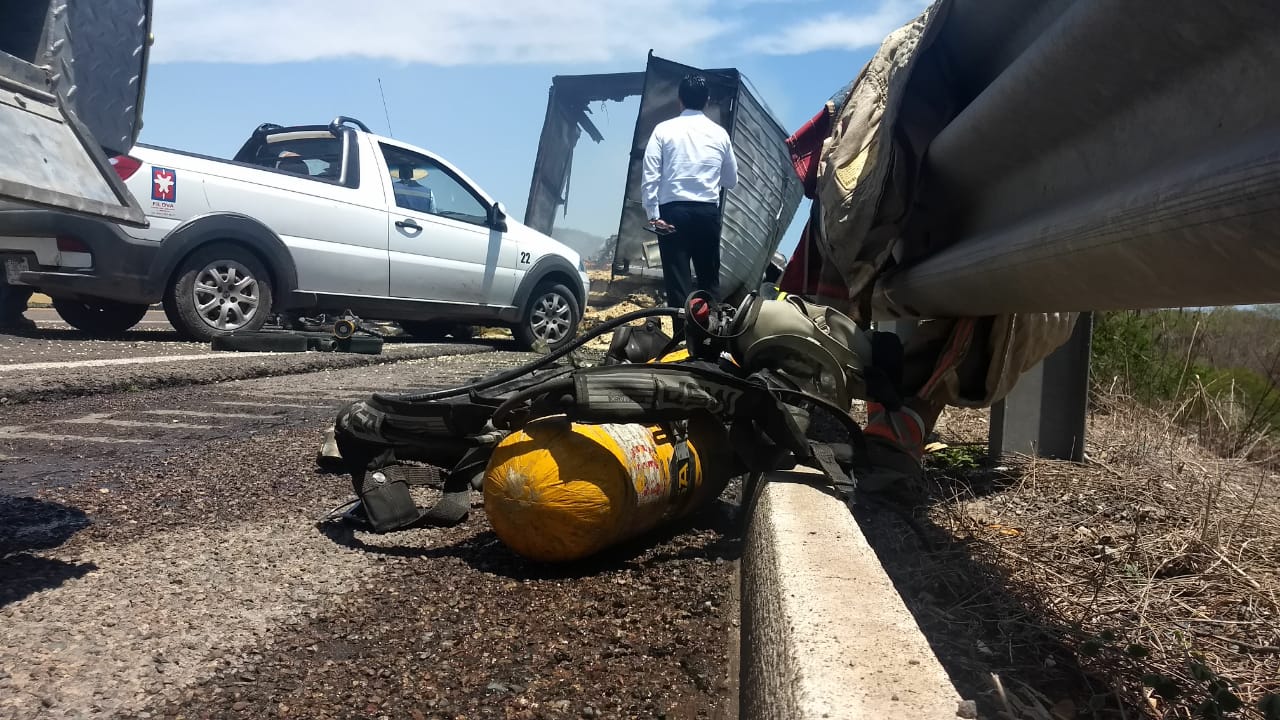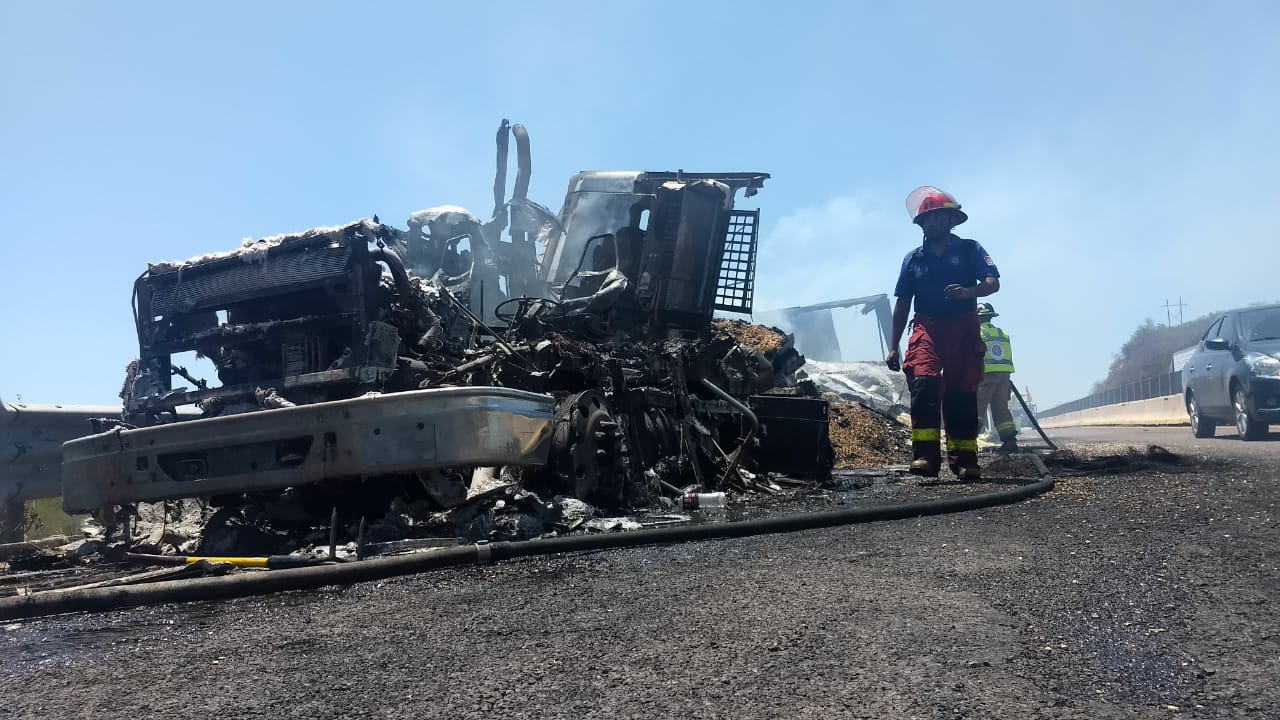 Sin precisar cuántas toneladas de grano quedaron afectadas, elementos del cuerpo de bomberos de Elota se trasladaron hacia el kilómetro 74, en Estación Dimas para controlar el fuego, aunque cuando llegaron, éste ya había consumido la cabina del tractocamión de la marca Internacional. Para suerte del chofer empleados que renuevan la carpeta asfáltica le dieron aviso de la conflagración y logró bajar sano y salvo.