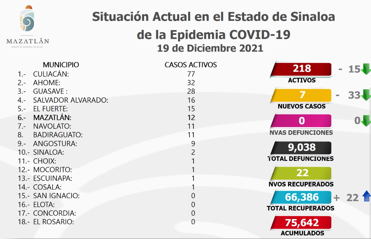 Mazatlán.- Desde hace 11 días, el puerto mantiene su tendencia favorable a la baja en los casos activos de Covid-19, y hoy amaneció con 12 pacientes del virus Sars-Cov-2, informó Cristian Castillo López, encargado de Protocolos y Sanidad del Gobierno Municipal.