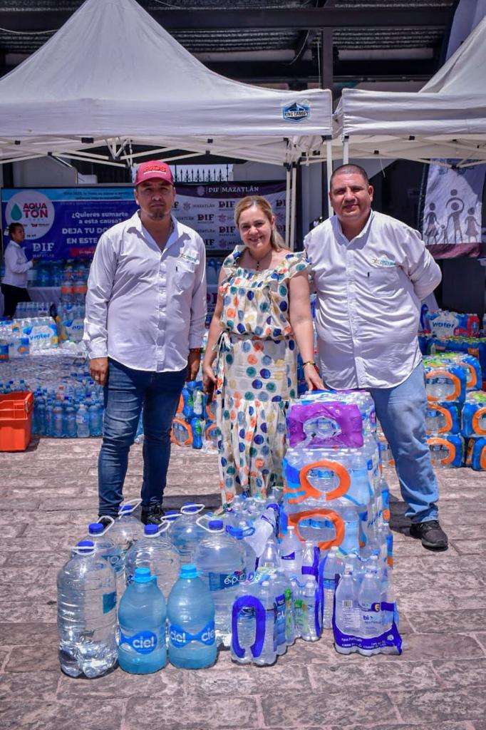 Adicionalmente, el Sistema DIF Mazatlán y el Gobierno Municipal instalaron módulos en oficina central de DIF Mazatlán, plaza Acaya, Gran Plaza y Plaza Ley El Mar, puntos hasta donde grandes y pequeños acudieron a dejar su donativo en agua purificada.