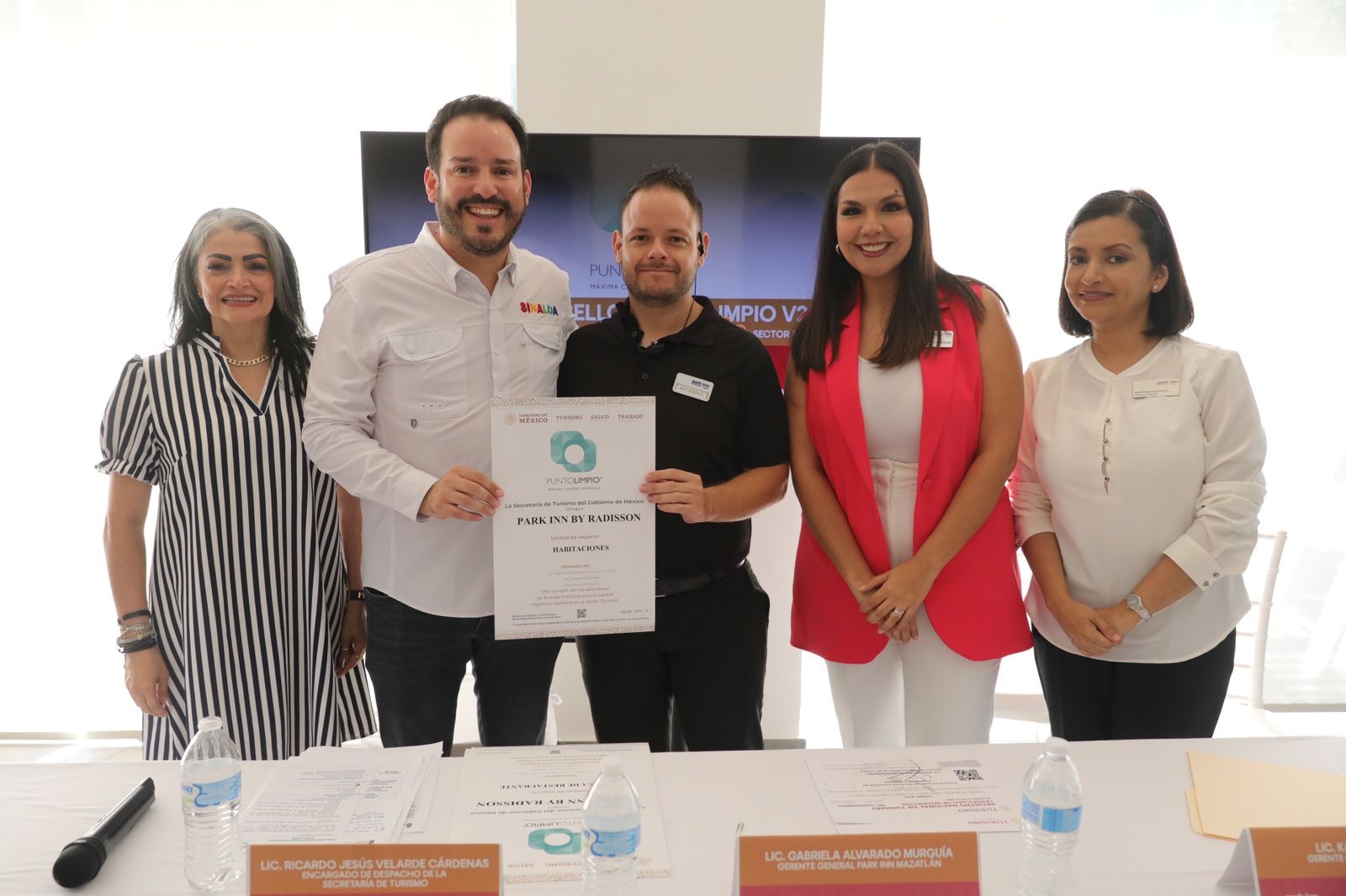 Mazatlán, Sin., julio 17 de 2024.- El representante de la Secretaría de Turismo, Ricardo Velarde Cárdenas, entregó el distintivo Sello Punto Limpio, a cinco establecimientos del hotel Park Inn by Radisson, de Mazatlán, por propiciar la incorporación de las buenas prácticas para la calidad higiénica, a fin de proteger la salud de sus clientes, de sus trabajadores y de las comunidades receptoras.