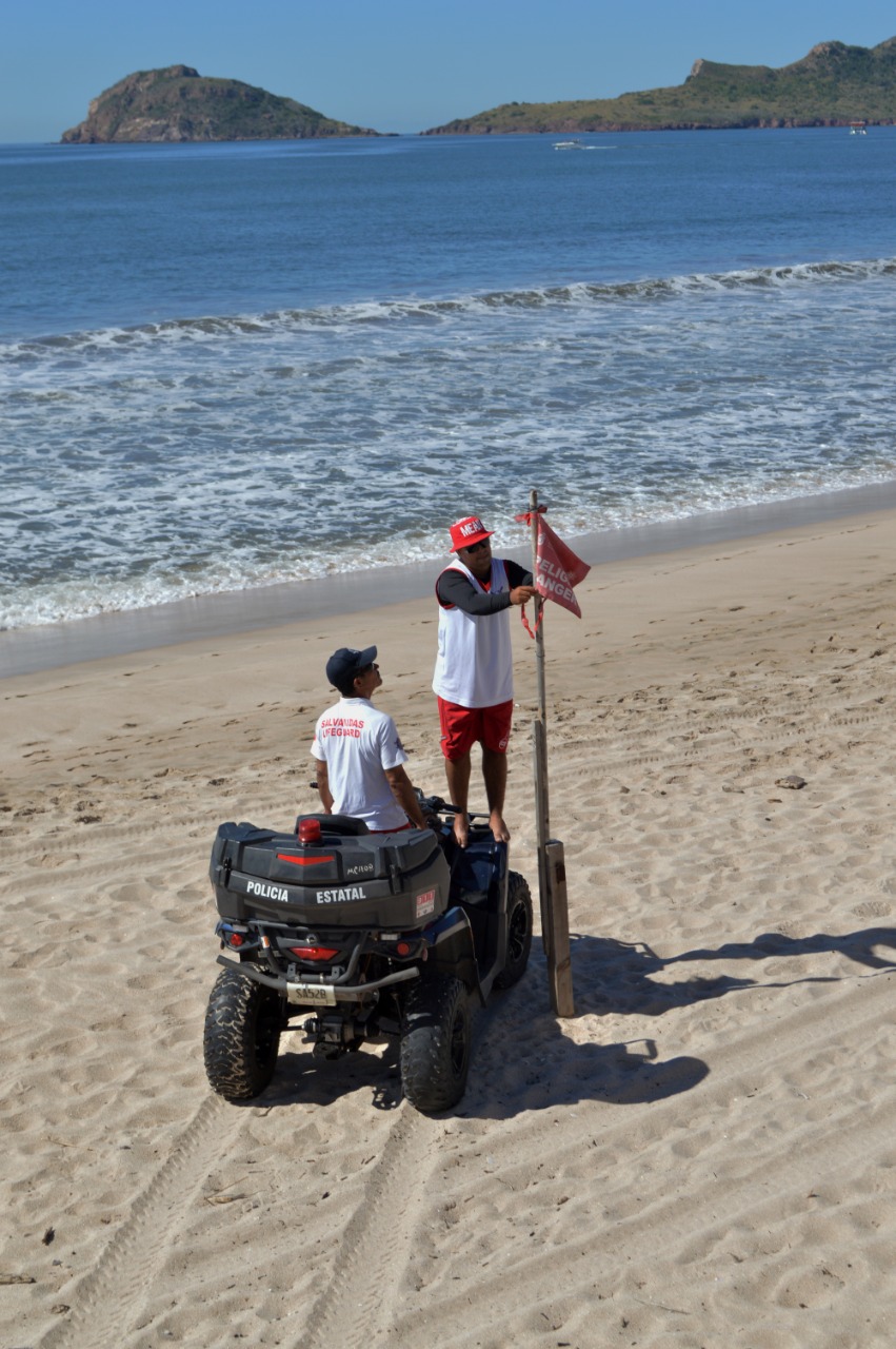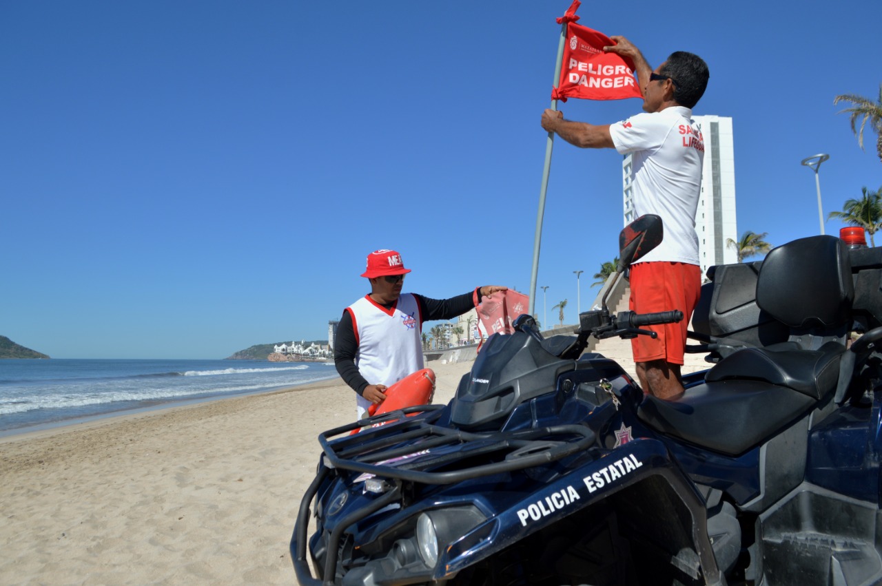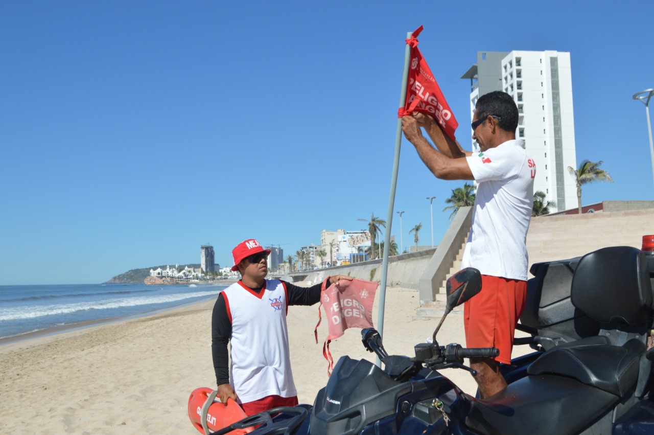 MAZATLÁN.- Con el fin de tener bien señalizadas las zonas de playa y que los bañistas puedan conocer las condiciones que prevalecen en el mar, el Escuadrón de Salvamento Acuático de la Secretaría de Seguridad Pública de Mazatlán se dio a la tarea de colocar banderines nuevos.