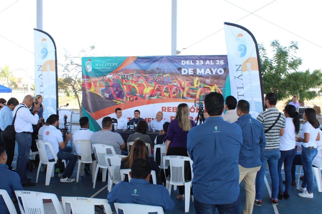 En conferencia de prensa, el Químico Benítez, acompañado de Humberto Álvarez, director de Imdem; Roberto Rodríguez, director de DIF Mazatlán; David González Torrentera, director de Sedectur y del gerente general de Gran Plaza, Israel Sandoval Vázquez, anunciaron que el «Rebotón y Resbalón» es un evento totalmente gratuito que contará con todas las medidas de seguridad necesarias para que niños y adultos disfruten de los inflables al máximo.