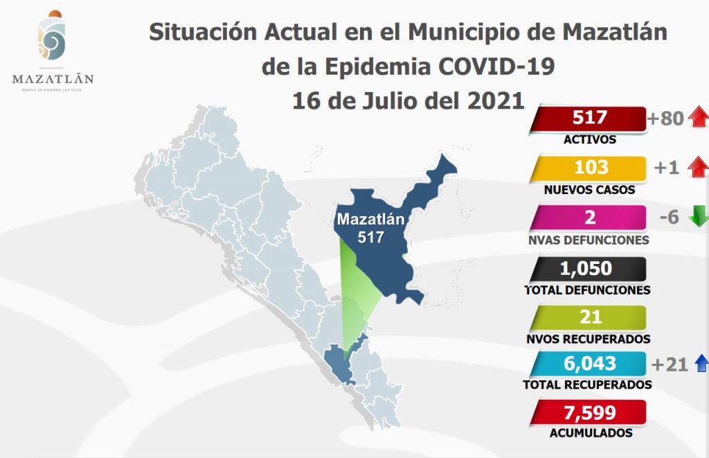 Este sábado Mazatlán registra 517 casos activos de Covid-19, por lo que continúa en color rojo del Semáforo Epidemiológico Estatal y es el segundo municipio con más pacientes, superado sólo por la ciudad de Culiacán con 2 mil 063.