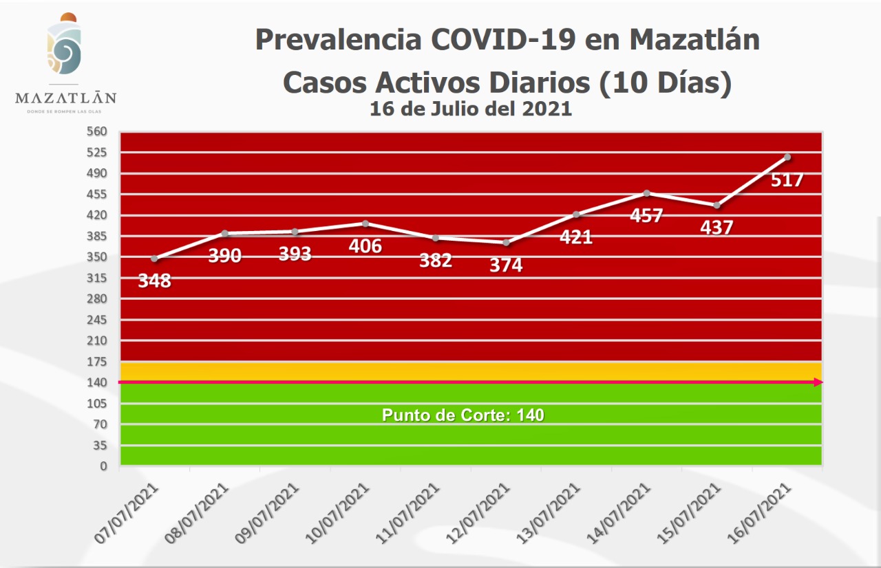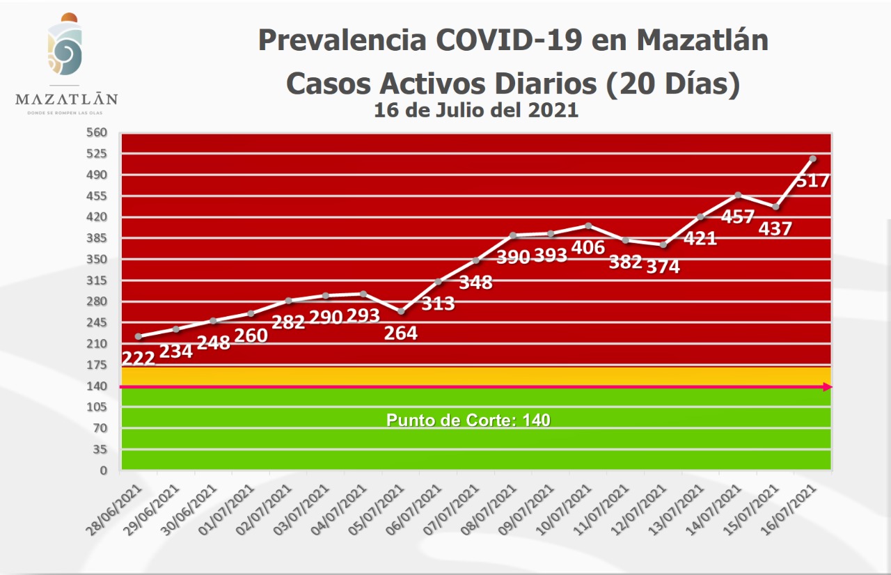 Este sábado Mazatlán registra 517 casos activos de Covid-19, por lo que continúa en color rojo del Semáforo Epidemiológico Estatal y es el segundo municipio con más pacientes, superado sólo por la ciudad de Culiacán con 2 mil 063.
