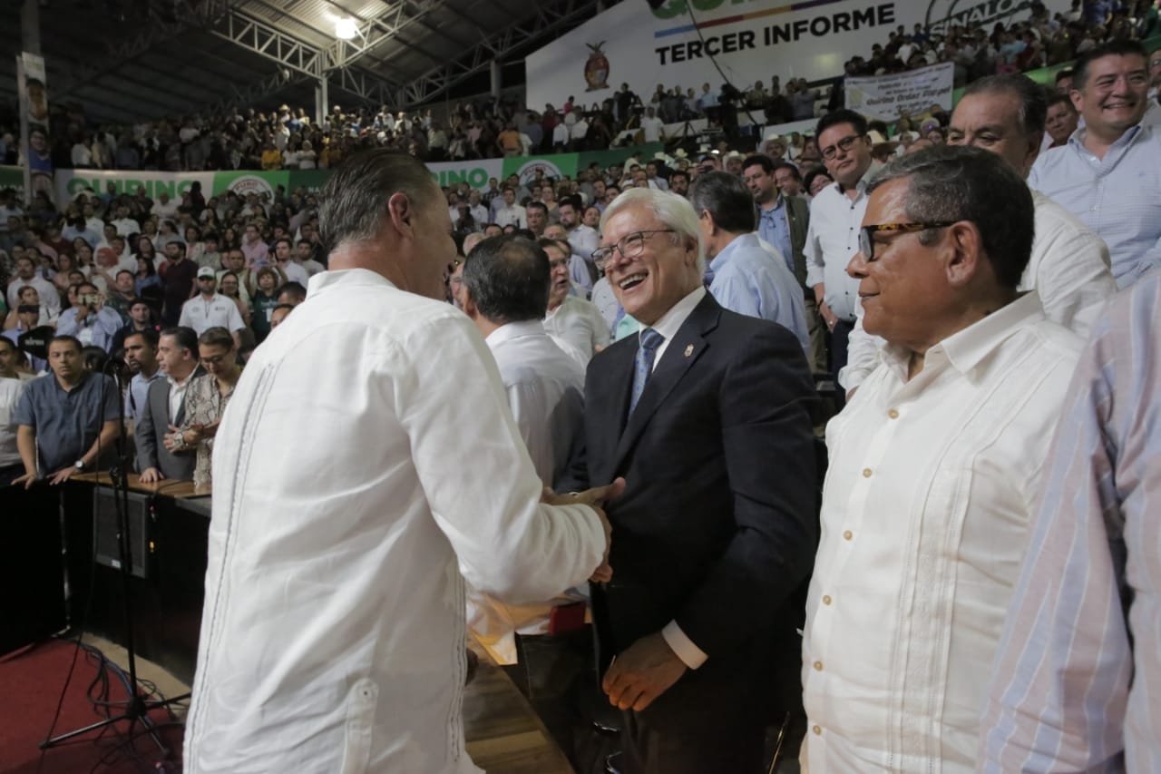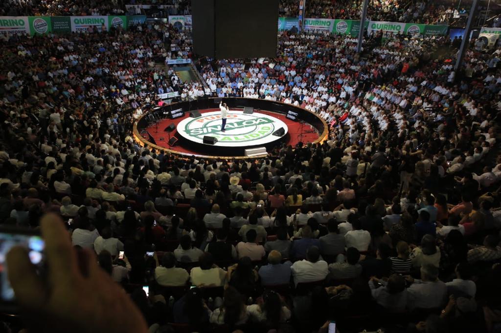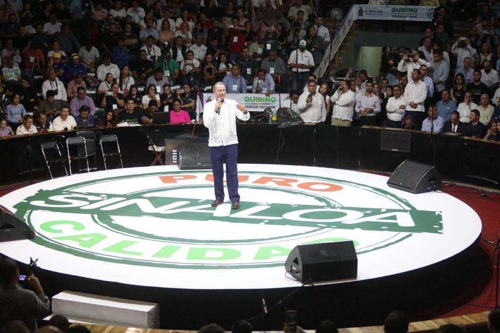 Culiacán, Sinaloa, a 19 de noviembre de 2019.- Rodeado por miles de sinaloenses, en un estrecho acercamiento con la gente, el gobernador Quirino Ordaz Coppel rindió un mensaje con motivo de su Tercer Informe de Gobierno, en el Palenque de la Feria Ganadera de Culiacán, que lució un lleno total, desde donde destacó que su administración ha impulsado una inversión superior a los 16 mil millones de pesos en obras de infraestructura de impacto social, como cuatro nuevos hospitales, sin generar deuda.