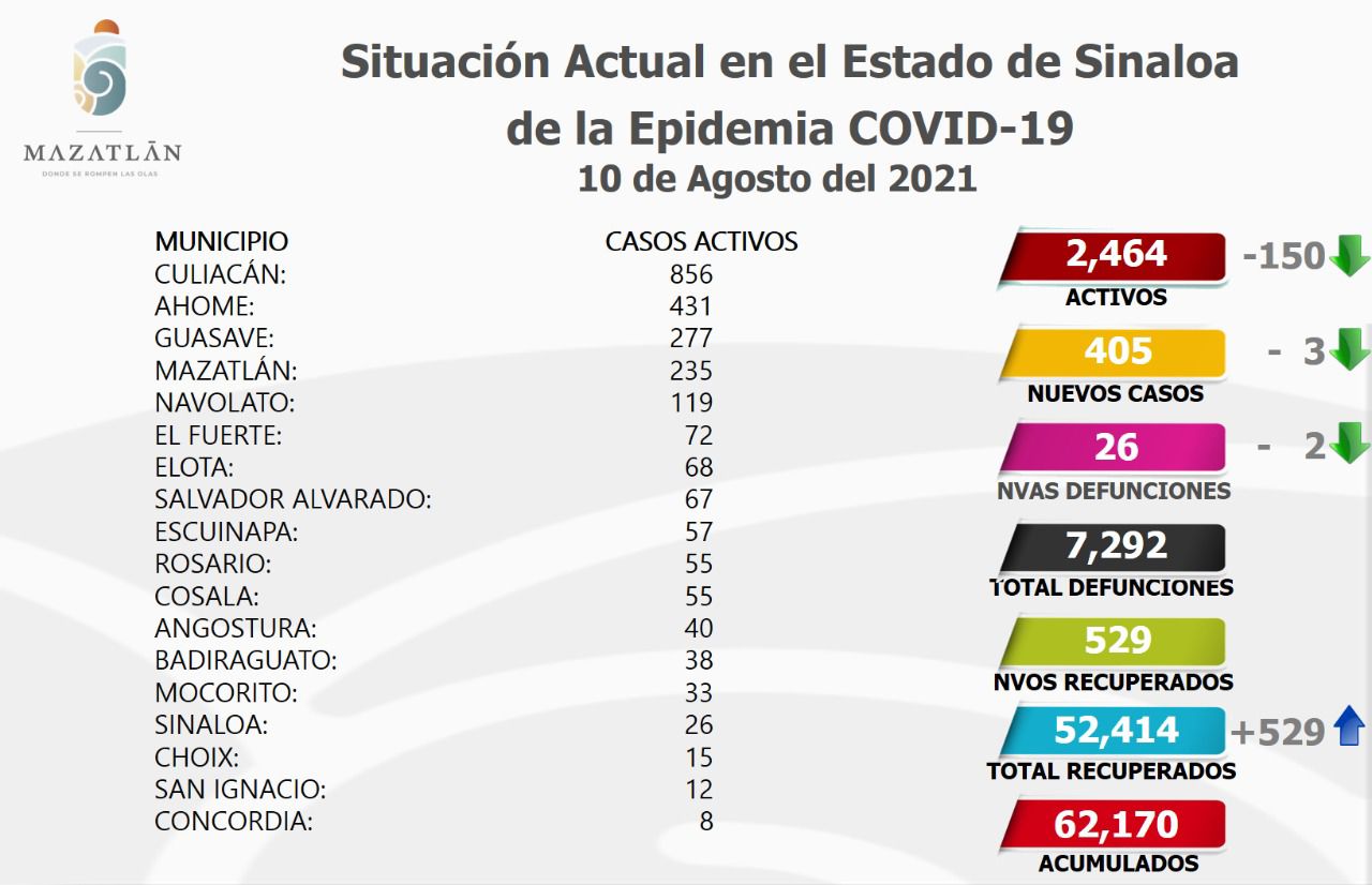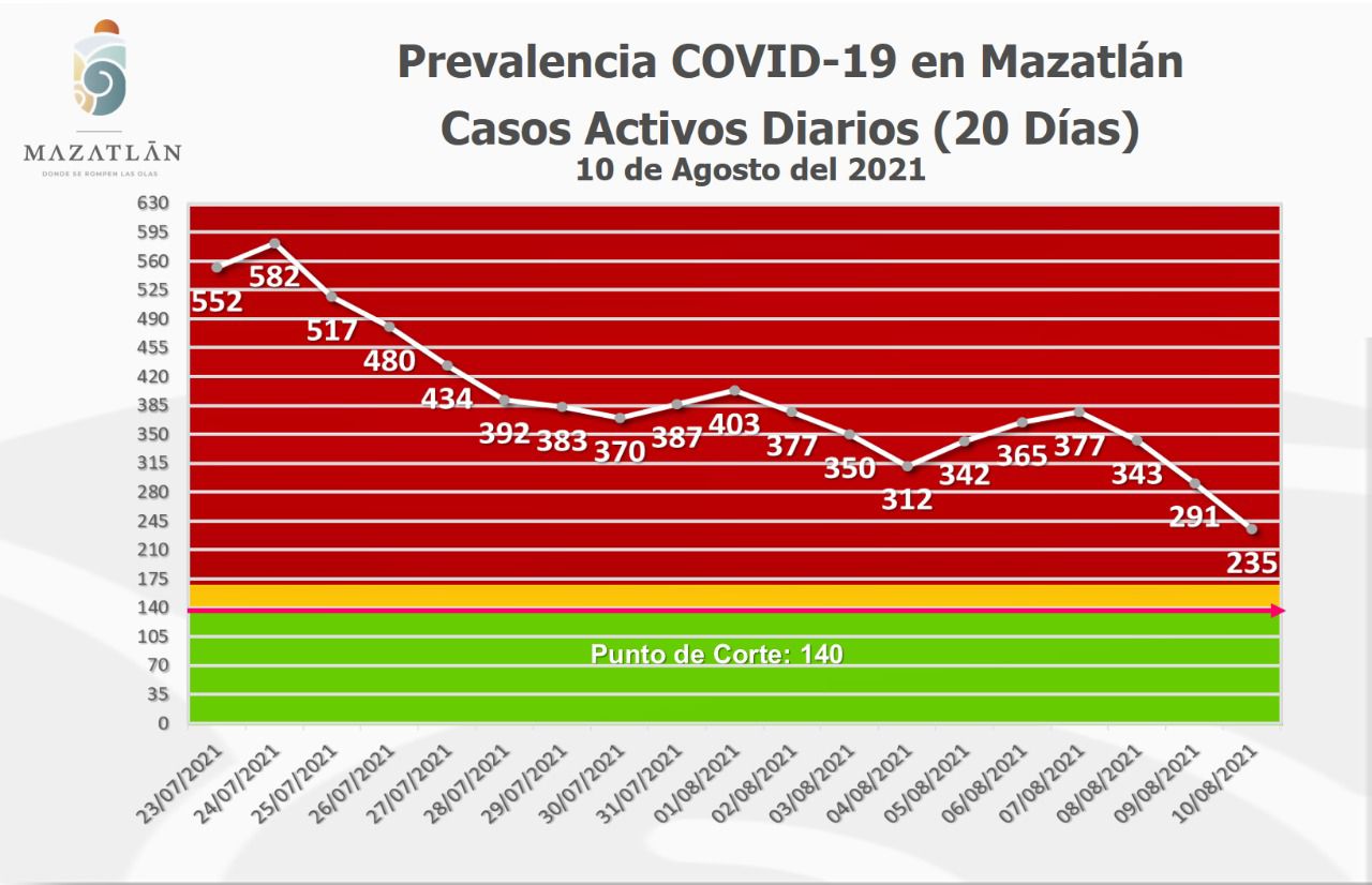 Mazatlán.- Este miércoles, la ciudad cumple tres días consecutivos con una disminución en los casos activos de Covid-19 y hoy tiene 235 pacientes con el virus Sars-Cov-2, informó Cristian Castillo López, encargado de Protocolos y Sanidad el Gobierno Municipal.