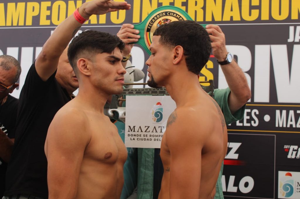 Pedro Guevara y Janiel Rivera, protagonistas de la pelea estelar de la función presentada gratuitamente por el H. Ayuntamiento de Mazatlán como regalo para los padres, no tuvieron problemas para superar a la báscula en la ceremonia de pesaje realizada en el Parador Fotografico de Mazatlán, previo a su enfrentamiento de este sábado por el título internacional supermosca de la WBC que ostenta el mazatleco.