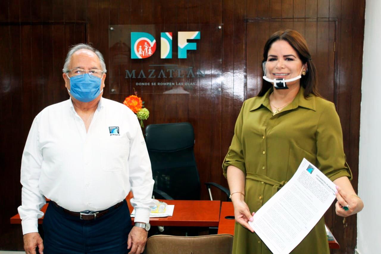 La Señora Gabriela Peña Chico se reunió con el Gerente General de la Junta Municipal de Agua Potable y Alcantarillado de Mazatlán, el Ingeniero Ismael Tiznado Ontiveros, para firmar un convenio en donde JUMAPAM otorgará el 20% de descuento en el recibo de suministro de agua potable y servicio de saneamiento a adultos mayores que estén inscritos en el Programa de INAPAM de DIF Mazatlán.