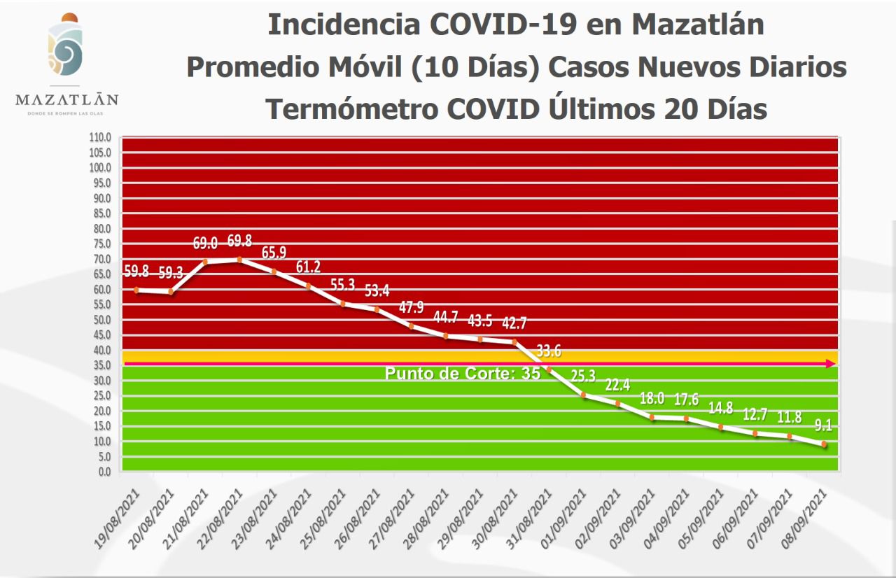 Castillo López destacó que Mazatlán se mantiene en color verde tanto en el Semáforo Epidemiológico Estatal como en el Termómetro Covid del Municipio, que se ubicó en los 9.1 grados y también lleva ya 17 días consecutivos a la baja.
