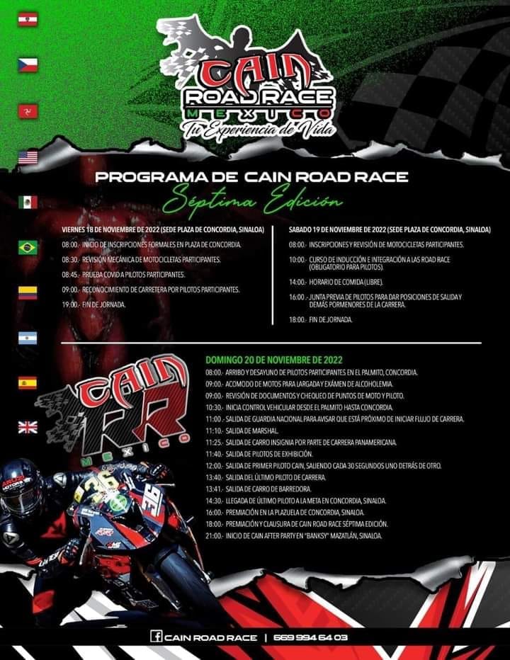 Para los amantes de la adrenalina, del 18 al 20 de noviembre llega la séptima edición de la carrera Cain Road Race al municipio de Concordia, que rugan las motocicletas.