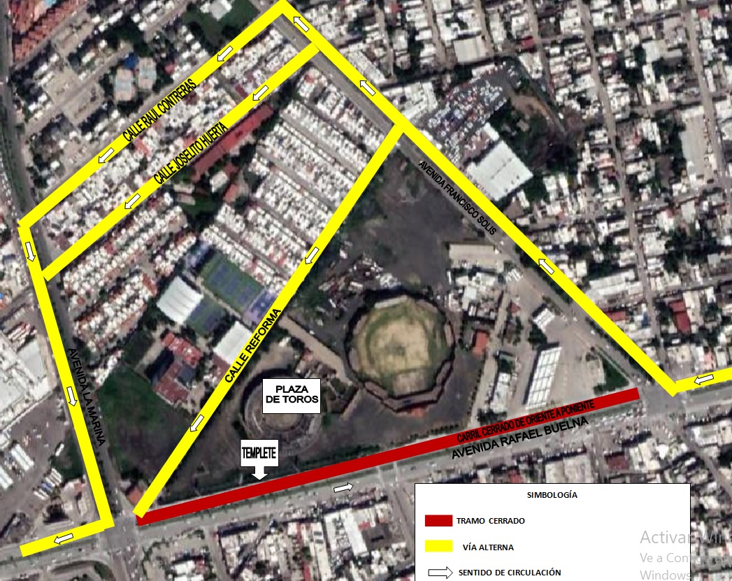 En el caso de la avenida Rafael Buelna, dijo que a partir de las 14:00 horas y hasta las 22:00 horas, aproximadamente, estará cerrado el carril que va de oriente a poniente, es decir el que va pegado a la Plaza de Toros.